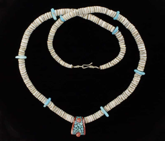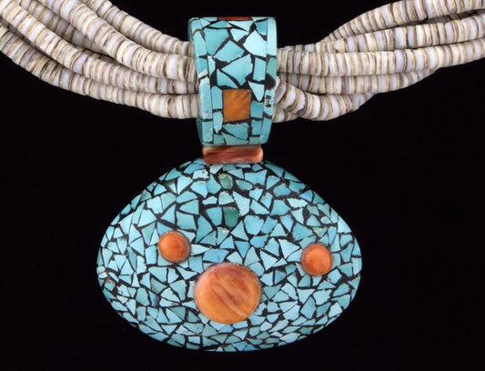 6-Strand Olive Shell Heishi Necklace With Inlaid Turquoise & Orange Spiny Oyster Shell Pendant