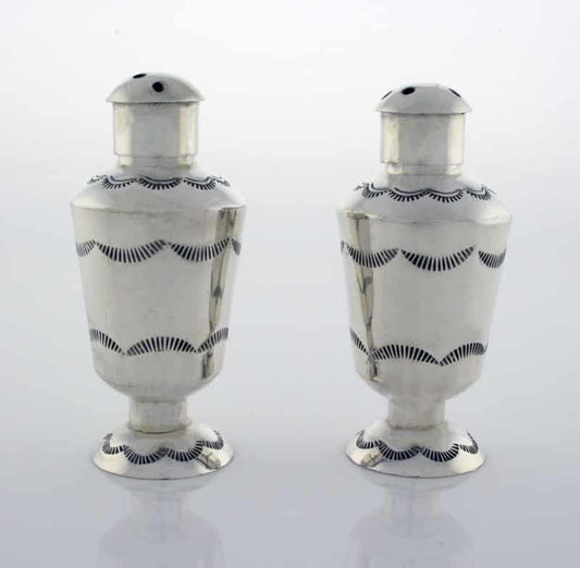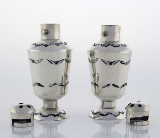 Our Native American salt and pepper shakers are designed to add an artistic touch to your dining room table or kitchen decor. Typically made from sterling silver, these shaker sets showcase intricate hand-stamped patterns.