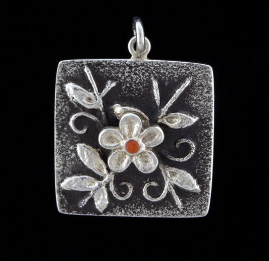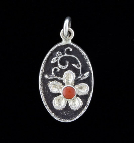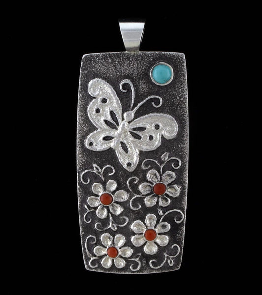 True to her usual style, Rebecca’s pendants feature elements found in nature and come in various shapes and sizes. They are adorned with small pieces of turquoise and coral set against oxidized silver for contrast. We recommend pairing them with a simple silver chain to emphasize the beauty of their craftsmanship.