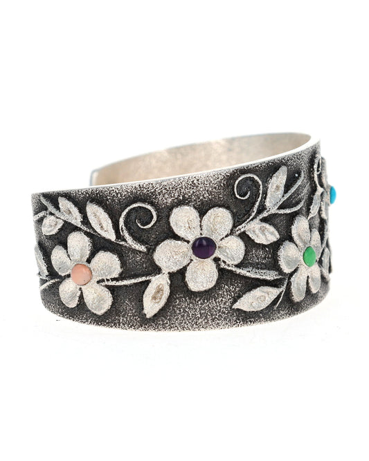 Begay's bracelets showcase a masterful understanding of texture and form. She uses oxidation to create depth in her designs and embellishes each piece with pinpricks of turquoise, coral, and sugilite.