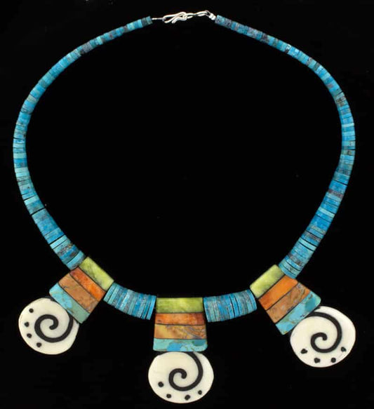 SilverTQ’s heishi necklace collection includes authentic pieces handmade using traditional craftsmanship. Their artists hand-roll and polish each tiny bead from natural shells, stones, and other materials using techniques passed down through centuries. The necklaces feature single-strand and multi-strand designs. Available in various lengths and color combinations, these heishi pieces represent an authentic expression of Pueblo culture.