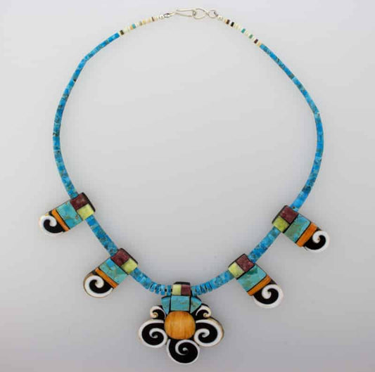 Collana Heishi in Turchese Kingman con 5 Tasselli Inlay in Pietre Multiple