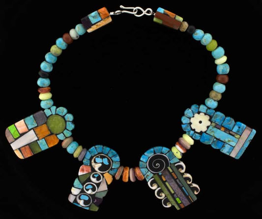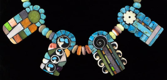 SilverTQ’s collection of unique multi-stone creations represents an innovative blend of classic and modern craftsmanship. This collection includes designs such as chunky multi-color inlay bracelets, pink mussel shell inlay earrings, Kewa mosaic slab earrings with multi-stone inlay borders, and multi-strand coral bead necklaces. These jewelry pieces reflect the Pueblo community's evolving artistry and distinctive styles.