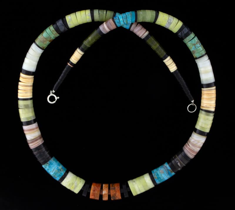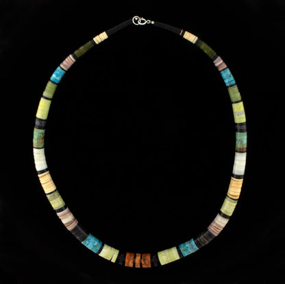 Collana Heishi di pietre e conchiglie esotiche multicolori graduata da 22" che include Jet della Pennsylvania, marmo Picasso nero/grigio, conchiglia oliva grigia, serpentino verde scuro, serpentino verde mela, Butterstone, turchese verde Nevada, turchese Kingman, conchiglia bianca spessa, conchiglia di cozza rosa, conchiglia di pinna marrone scuro e corallo mela.  NESSUN MATERIALE IMITATIVO UTILIZZATO.  Eccellentemente realizzata a mano e progettata dagli artisti marito e moglie del Pueblo di Santo Domingo GERARD & MARY L. CALABAZA.