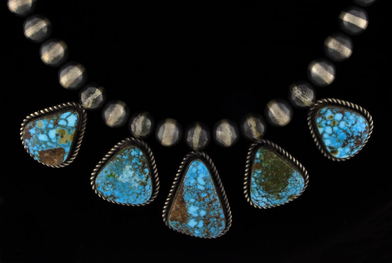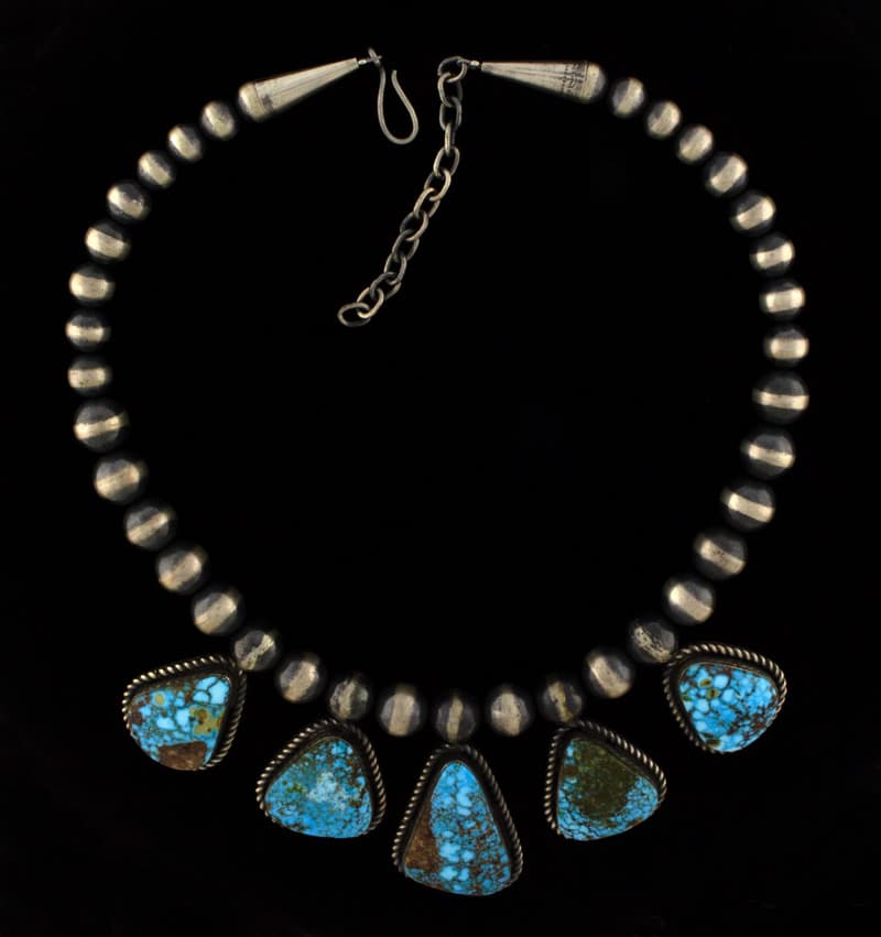 Collana di perle in argento sterling graduata di lunghezza regolabile da 20" a 22,5" "Stile Antico" appesa con 5 impressionanti schede di turchese naturale a forma triangolare Kingman. Tutte e 5 le schede di turchese naturale Kingman sono magistralmente realizzate a mano e progettate dall'artista Navajo NILA JOHNSON.