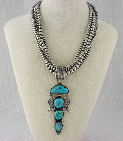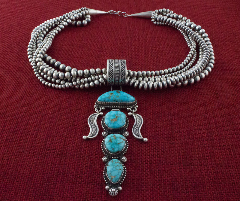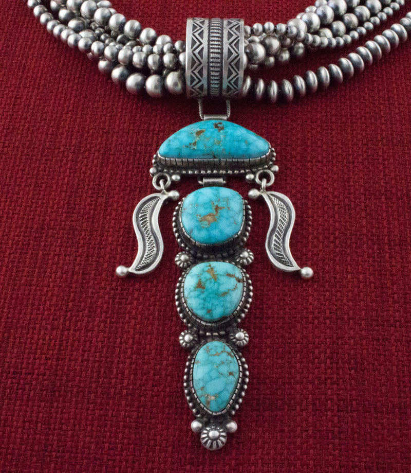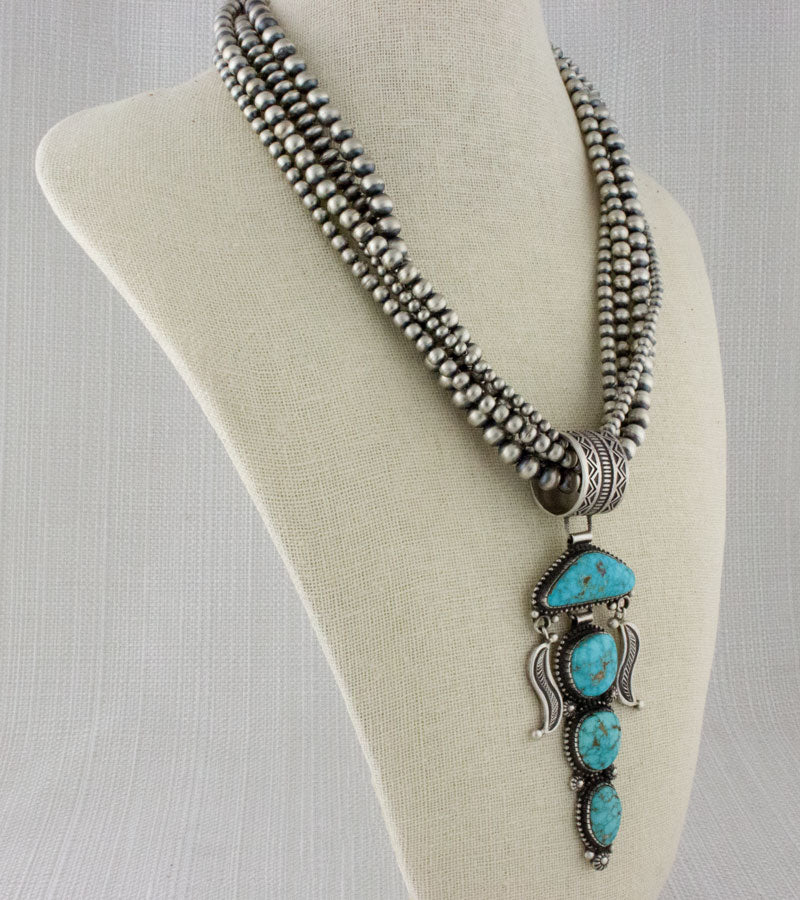 Collana di perline in argento sterling "Old Style" a 5 fili di lunghezza 20,5" con un pendente in argento sterling "Old Style" impreziosito da 4 pietre di turchese naturale Kingman Water Web. Collana realizzata a mano e progettata dal defunto artista Navajo JAN MARIANO. Pendente realizzato a mano e progettato dall'artista Navajo CALVIN MARTINEZ.
