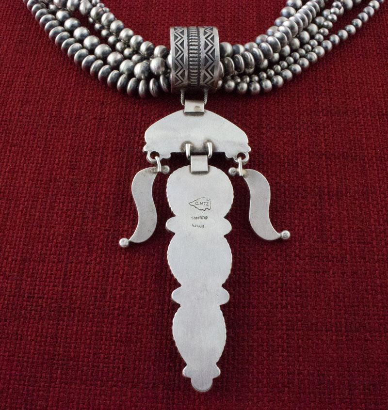• Artist Hallmarks:  "C. MTZ, Navajo" (hand stamped on back side of pendant); "J. MARIANO" (hand stamped on each of the two sterling silver necklace cones)