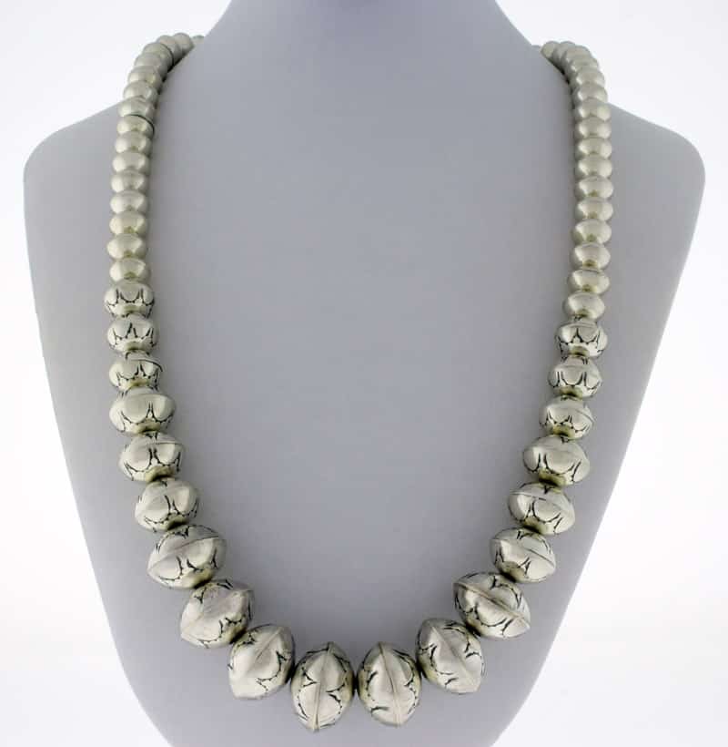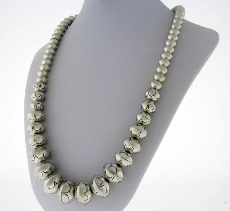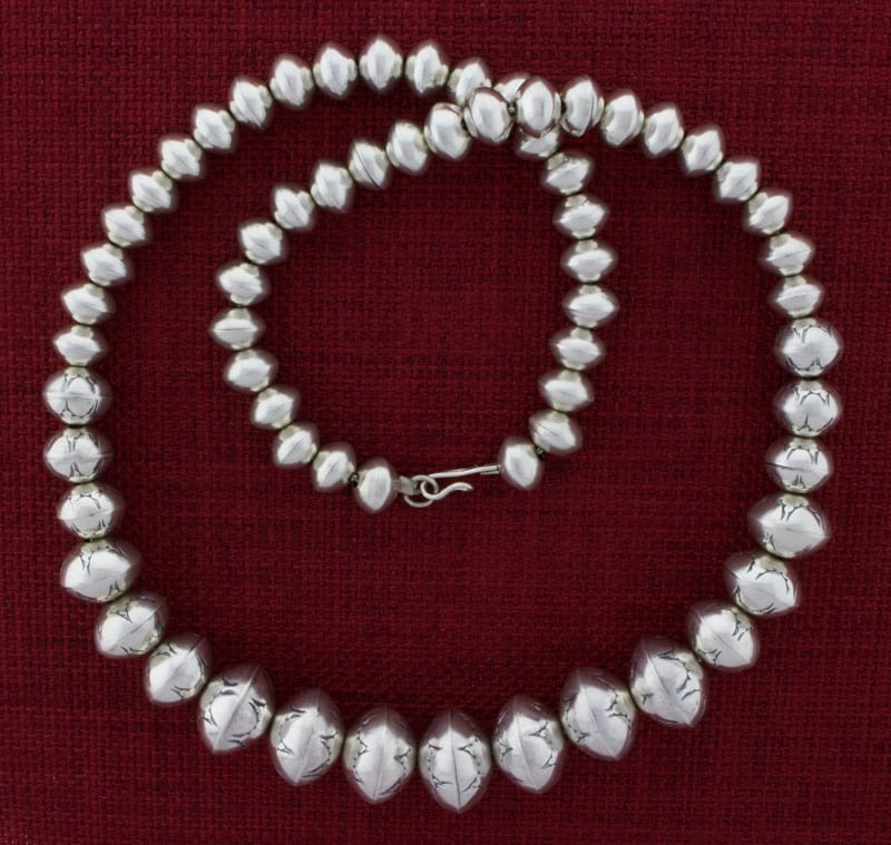Collana di perle in argento sterling graduata di 24" di lunghezza, realizzata e progettata dall'artista Navajo defunto JAN MARIANO.