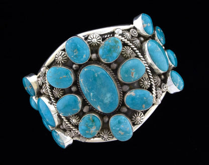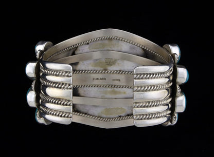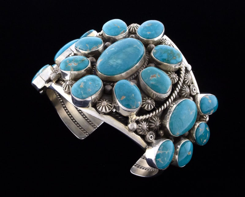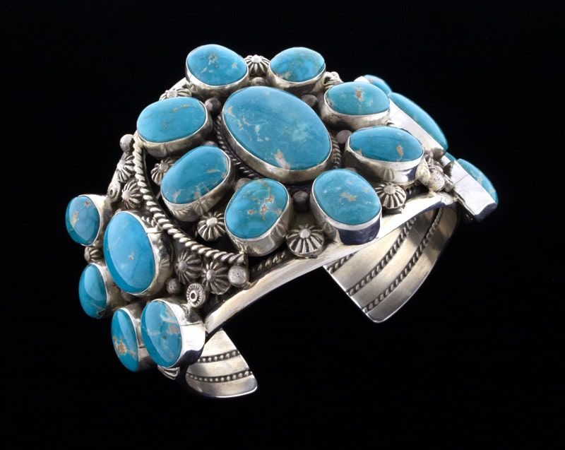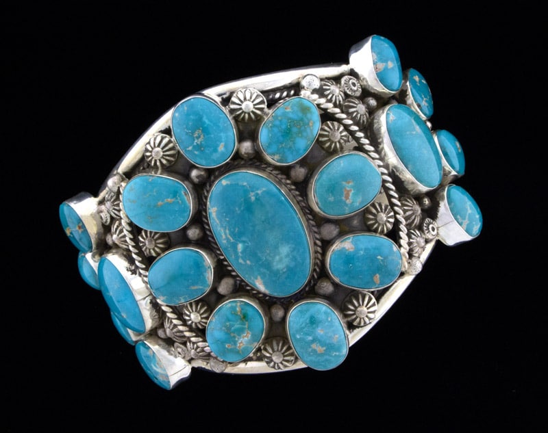 "Stile Antico" Bracciale in Argento Sterling Impreziosito da un Cluster di 19 Pietre di Turchese Fox Naturale di Alta Qualità (110 carati) Estratte Circa alla Fine degli Anni '60 Inizio Anni '70. Realizzato a Mano e Progettato dall'Artista Navajo ELLA M. LINKIN.