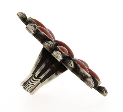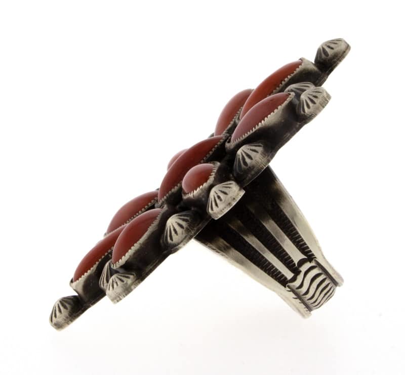 Anello in argento sterling di peso pesante "Old Style" di misura 7.5, impreziosito da un cluster di 9 pietre di corallo naturale mediterraneo di alta qualità. Realizzato e progettato magistralmente dall'artista Navajo CALVIN MARTINEZ.