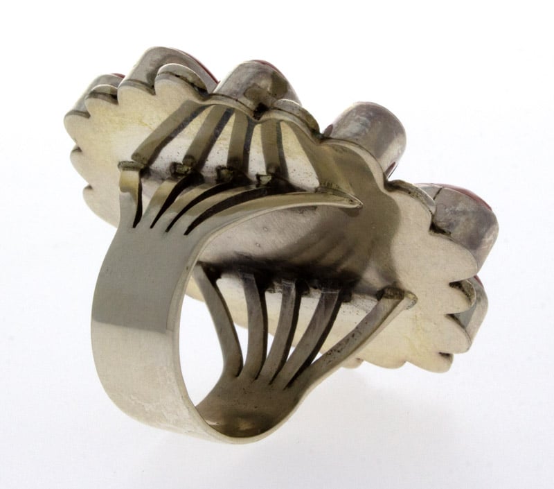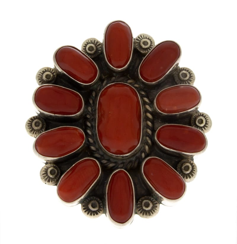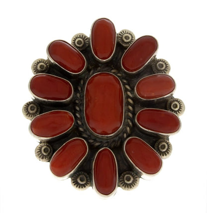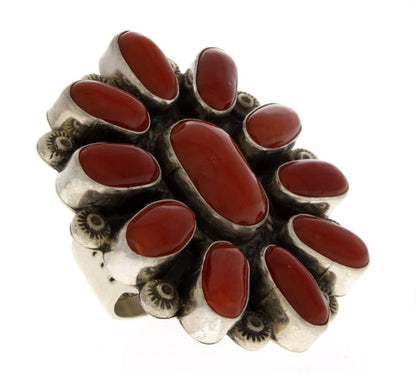 Anello in argento sterling "Old Style" di misura 8, impreziosito da un cluster di 11 pietre di corallo naturale mediterraneo di alta qualità. Realizzato a mano e progettato dall'artista Navajo ELLA M. LINKIN.