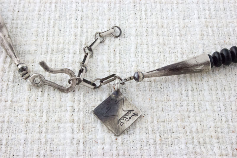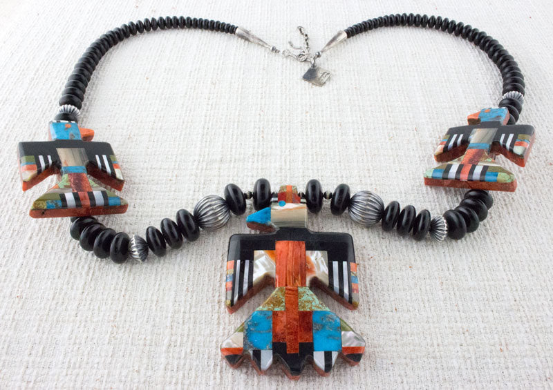 • Materials/Technique:  Hand Cut, Polished And Strung Graduated Rondelle Shaped Jet Beads; Handmade And Hand Stamped Satin Finish Sterling Silver Fluted Beads; Handmade Satin Finish Sterling Silver Bead Spacers; 3 Multi-Color Stone on Stone Inlay Thunderbirds Using Apple Coral (including backing), Kingman Turquoise, Jet, Mother of Pearl, Red & Orange Spiny Oyster, Serpentine, Lapis and Nevada Green Turquoise; Handmade Satin Finish Sterling Silver Cones And Chain With "Hook & Eye" Connector.