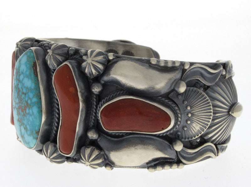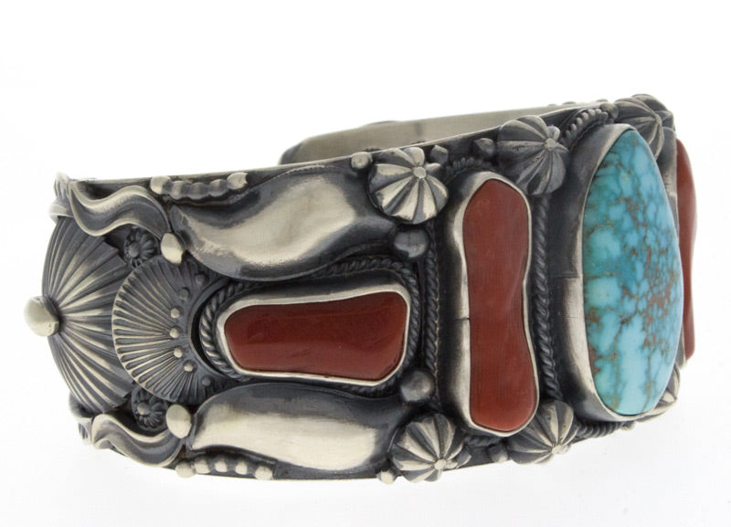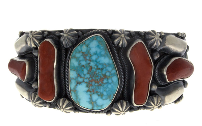 "Stile Antico" Bracciale in Argento Sterling Impreziosito da una Pietra di Turchese Kingman Birdseye Naturale e Quattro Pietre di Corallo Mediterraneo Naturale di Alta Qualità. Realizzato a Mano e Progettato dal Maestro Artigiano Navajo DELBERT GORDON.