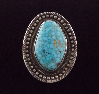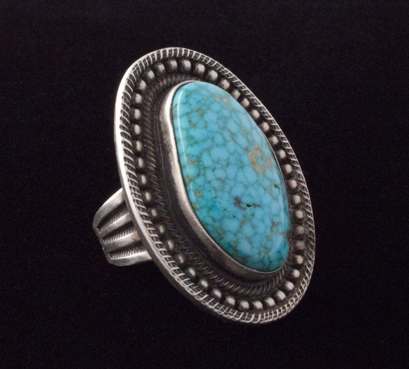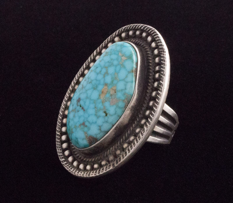 Anello in argento sterling "Old Style" di misura 8.5, impreziosito da una straordinaria pietra di turchese Kingman Birdseye naturale. Realizzato a mano e progettato dal maestro artista Navajo CALVIN MARTINEZ.