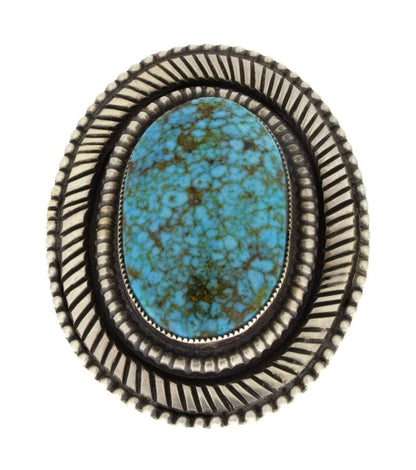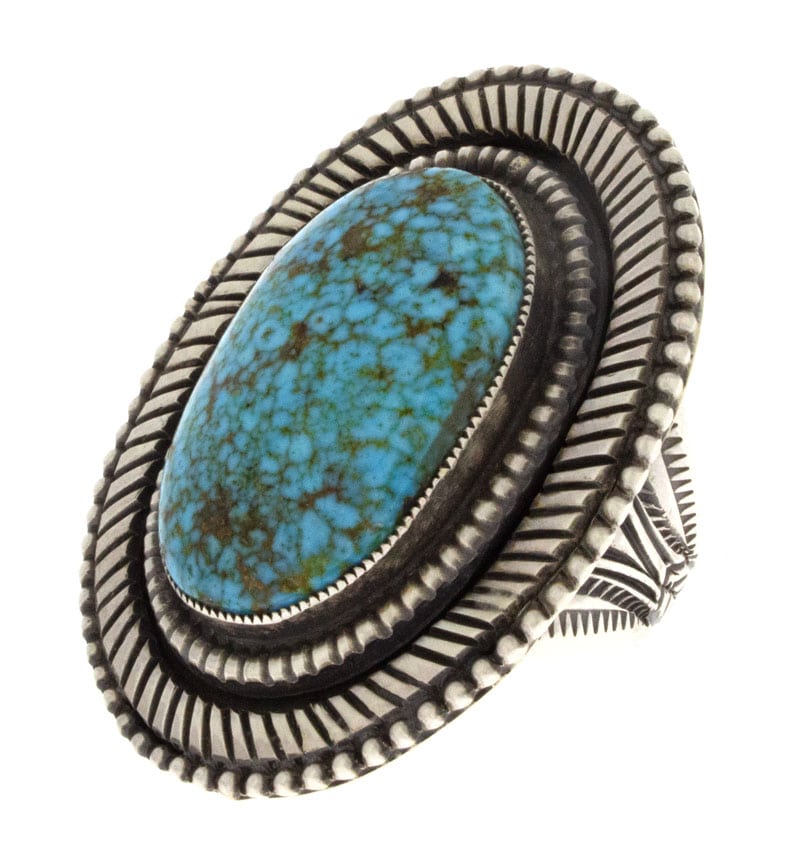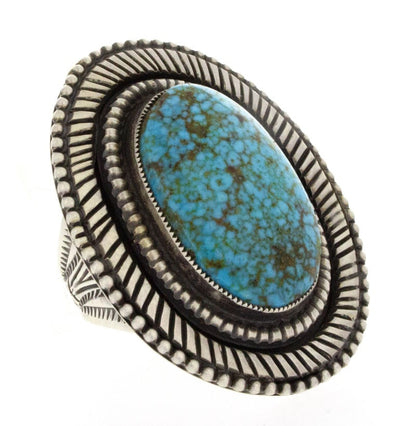 Anello dichiarativo in argento sterling pesante da 10 "Old Style" con un'impressionante pietra ovale di turchese naturale Birdseye Kingman. Realizzato a mano e progettato magistralmente dall'artista Navajo CALVIN MARTINEZ.