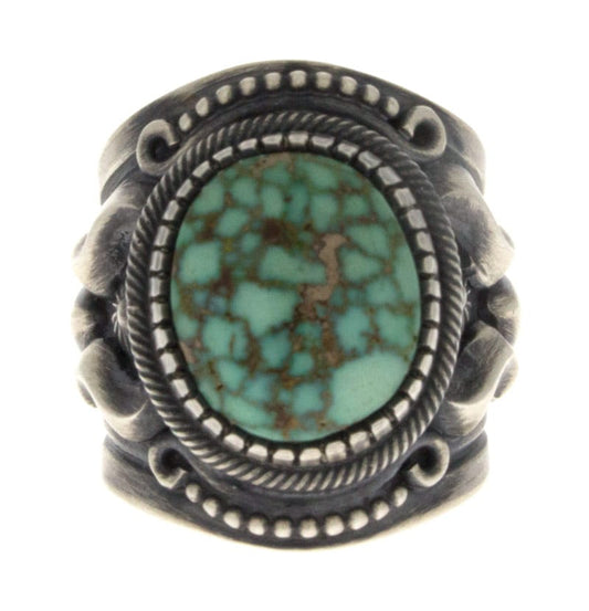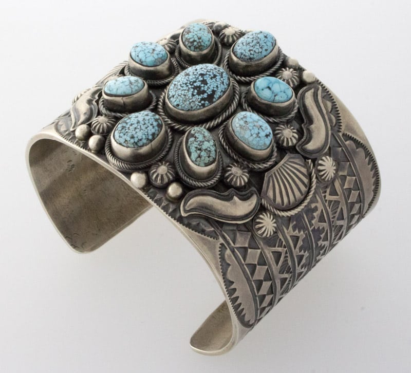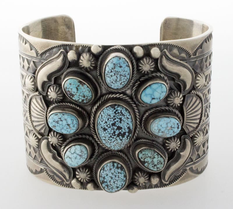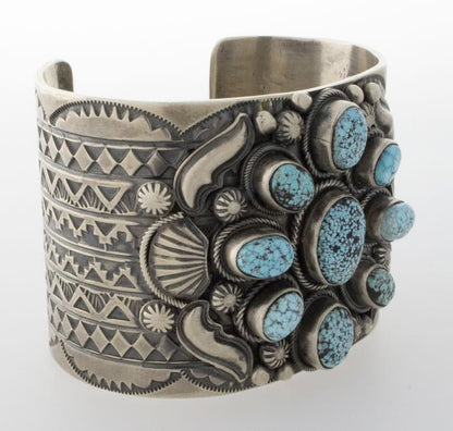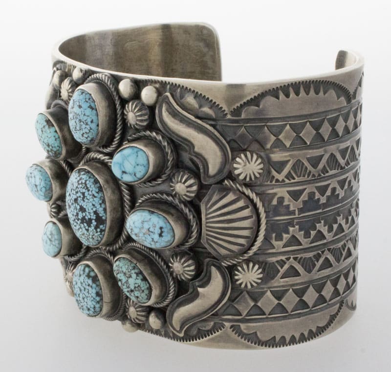 "Stile Antico" Bracciale in Argento Sterling Impreziosito da un Cluster di 9 Pietre Naturali di Turchese Kingman. Realizzato a Mano e Progettato dal Maestro Artigiano Navajo RAY BENNETT.