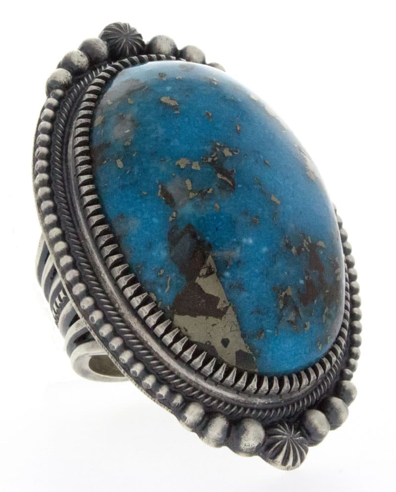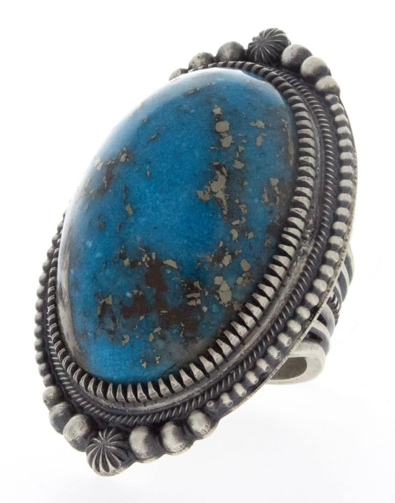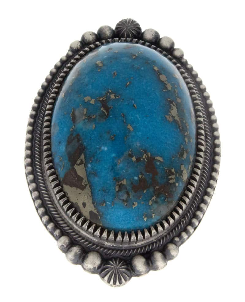 Anello in argento sterling pesante di calibro "Old Style" di misura 10.5, impreziosito da una straordinaria pietra di turchese persiano naturale a forma di cupola. Realizzato e progettato magistralmente dall'artista Navajo MILDRED PARKHURST.