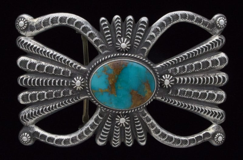 "Stile Antico" Fibbia per Cintura in Argento Sterling di Spessore Pesante Impreziosita da una Pietra di Turchese Naturale Royston. Realizzata a Mano e Progettata dal Maestro Artigiano Navajo ROLAND DIXSON.