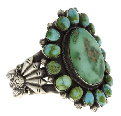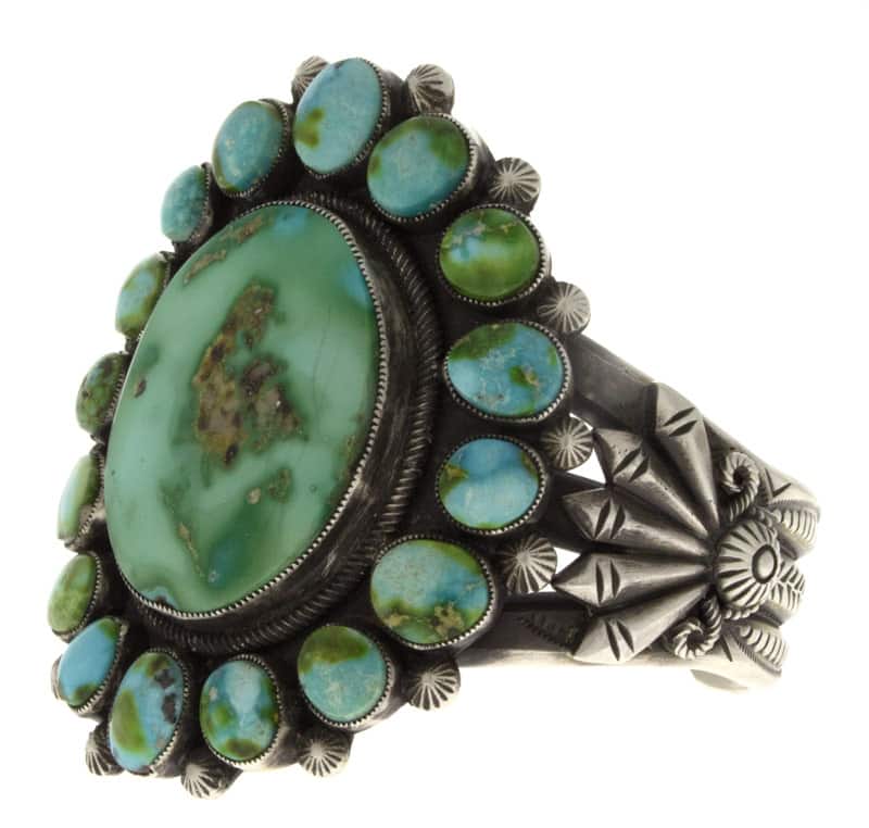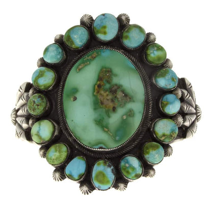 "Stile Antico" Bracciale in Argento Sterling Ingot Con Un Imponente Pietra Centrale Ovale Di Turchese Naturale Sonorano Circondata Da Un Cluster Di 16 Pietre Di Turchese Naturale Sonorano. Realizzato A Mano E Progettato Dal Artista Navajo CALVIN MARTINEZ.