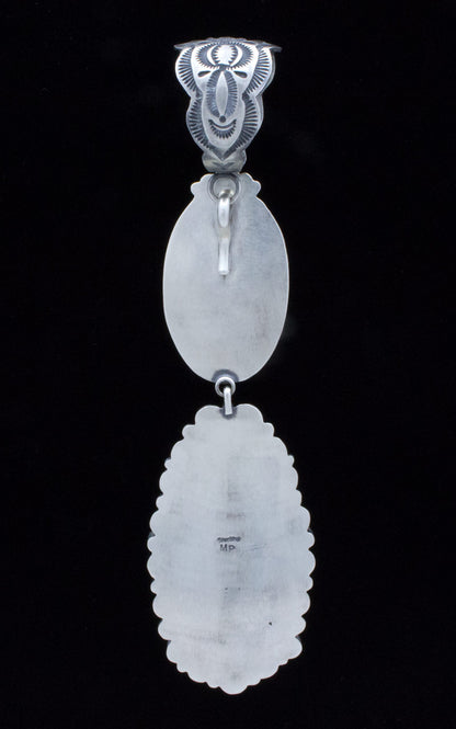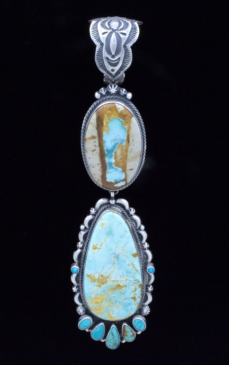 "Stile Antico" Pendente in Argento Sterling Impreziosito da una Pietra di Turchese Boulder Naturale in Alto e una Pietra di Turchese Royston Naturale in Basso. Inclusi anche 2 Pietre di Turchese Sleeping Beauty sui Lati Opposti e 5 Pietre di Turchese Kingman. Pendente Realizzato a Mano e Progettato dal Artista Navajo MURPHY PLATERO. Anello in Argento Sterling Rimovibile Appeso a Gancio da Pastore è un Design Fuso dell'Artista Navajo ELGIN TOM.