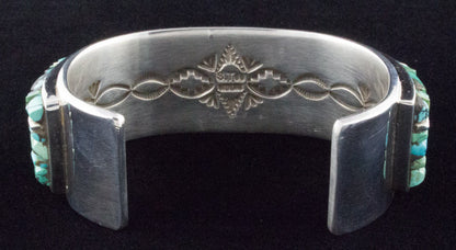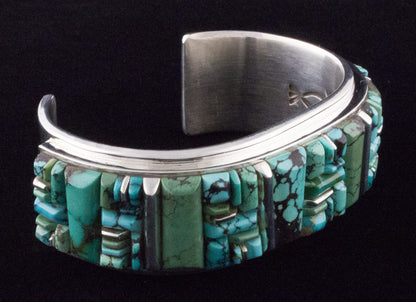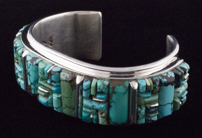 Bracciale in Argento Sterling con Design Incastonato a Cobblestone in Turchese Naturale, Composto da Turchese Naturale Royston, Turchese Naturale China Mountain e Spaziatori in Argento Sterling. Realizzato a Mano e Progettato dall'Artista Navajo SHEILA TSO.