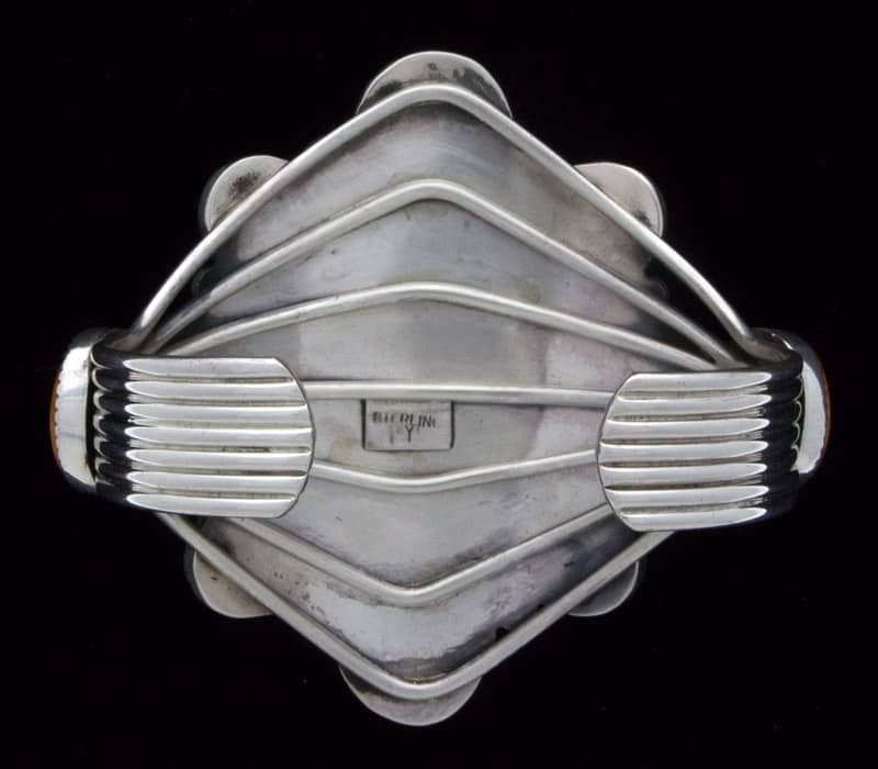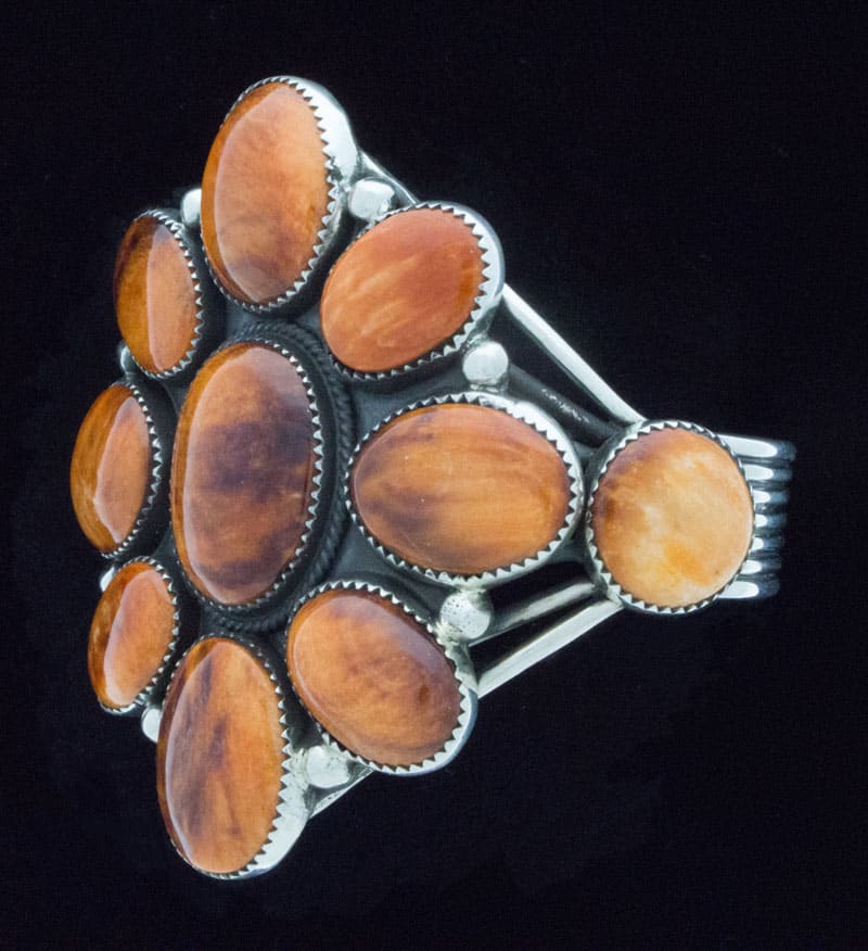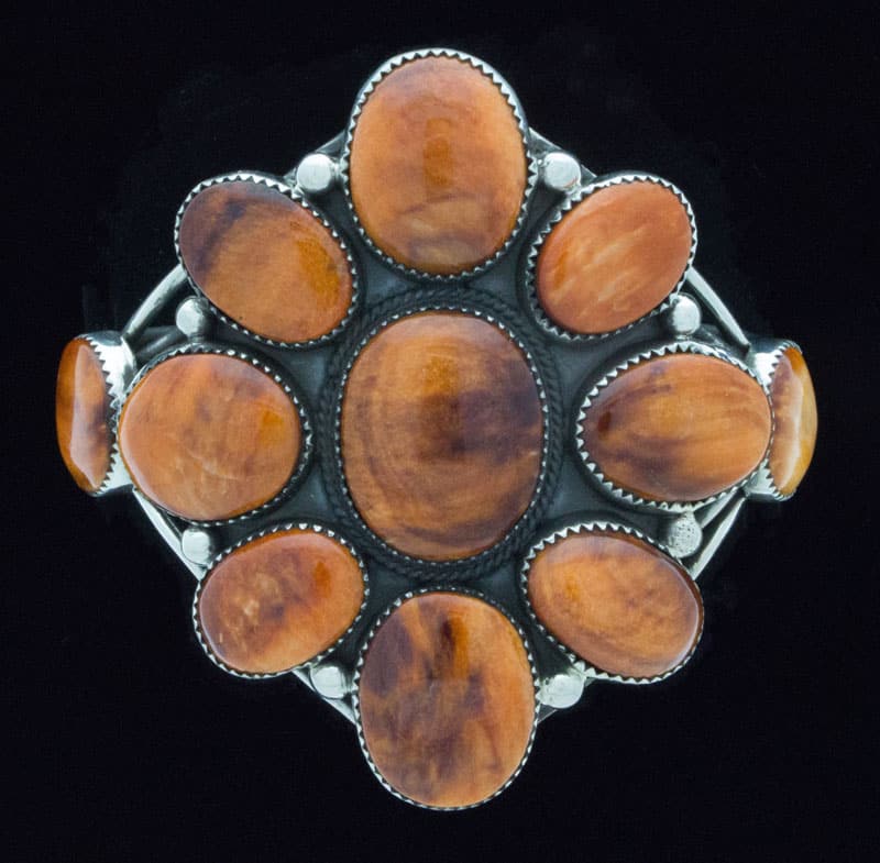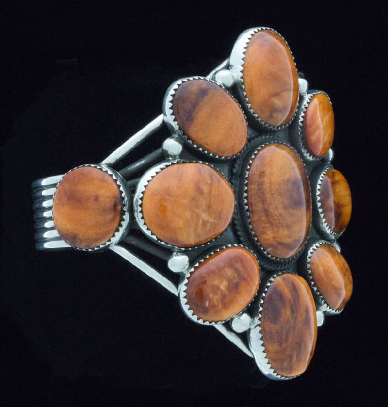 Bracciale in argento sterling con un cluster di 11 pietre di ostrica spinosa rosse/arancioni. Realizzato a mano e progettato dall'artista Navajo PHILLIP YAZZIE.