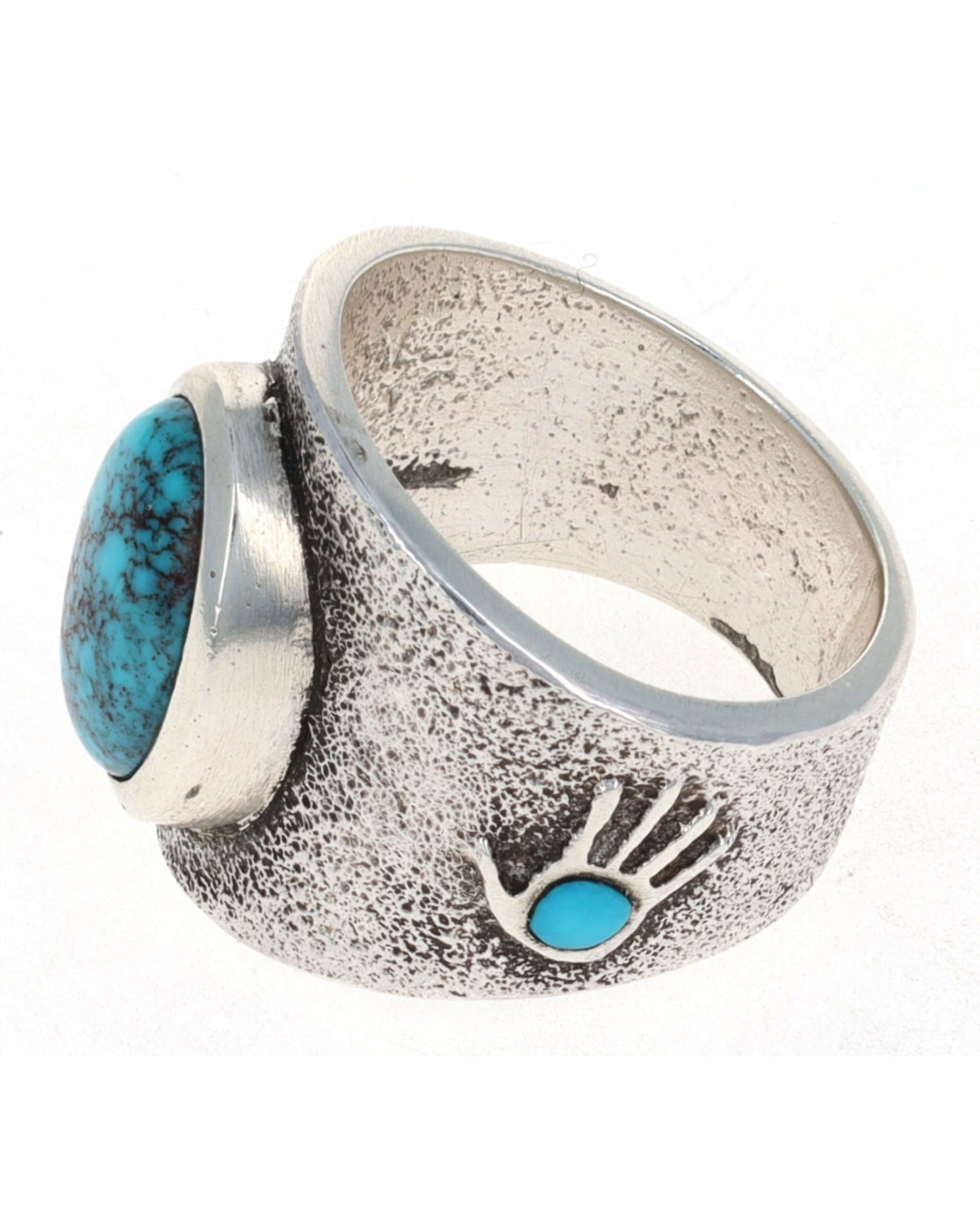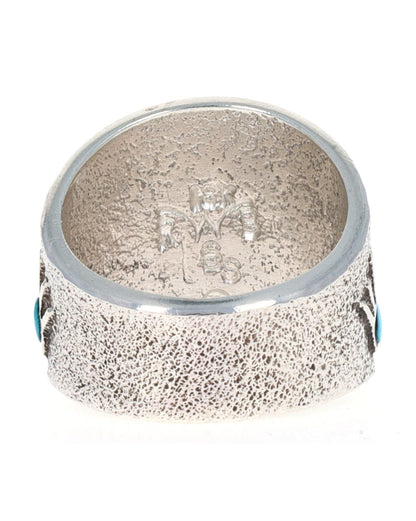 Anello in argento sterling 8,25 con pietra in pietra tufacea e una pietra naturale Bisbee Turchese di alta qualità. Il design include una figura intarsiata a mano in stile Anasazi posizionata su lati opposti, ciascuna con una piccola pietra naturale turchese Lone Mountain rotonda. Realizzato e progettato magistralmente a mano dall'artista Navajo ROBERT W. BEGAY.