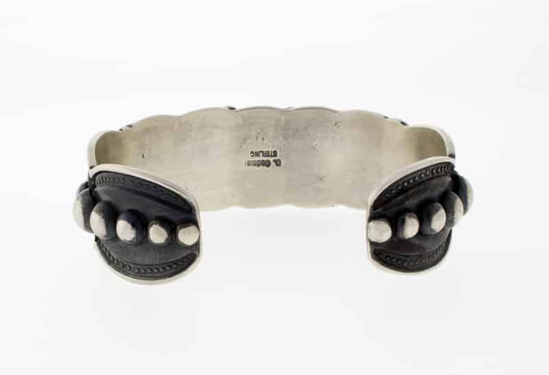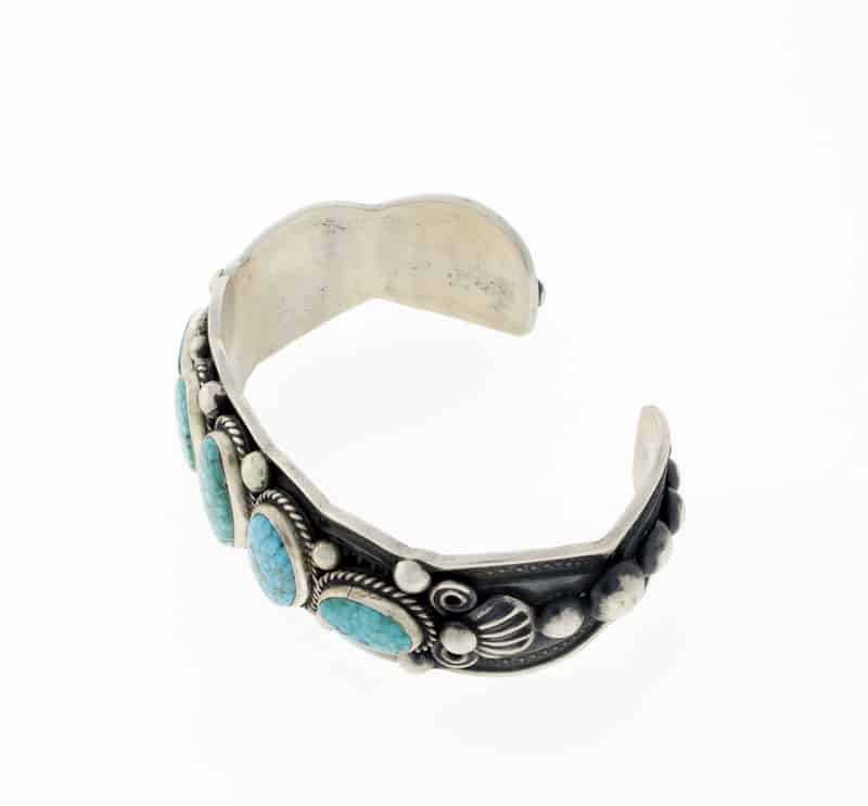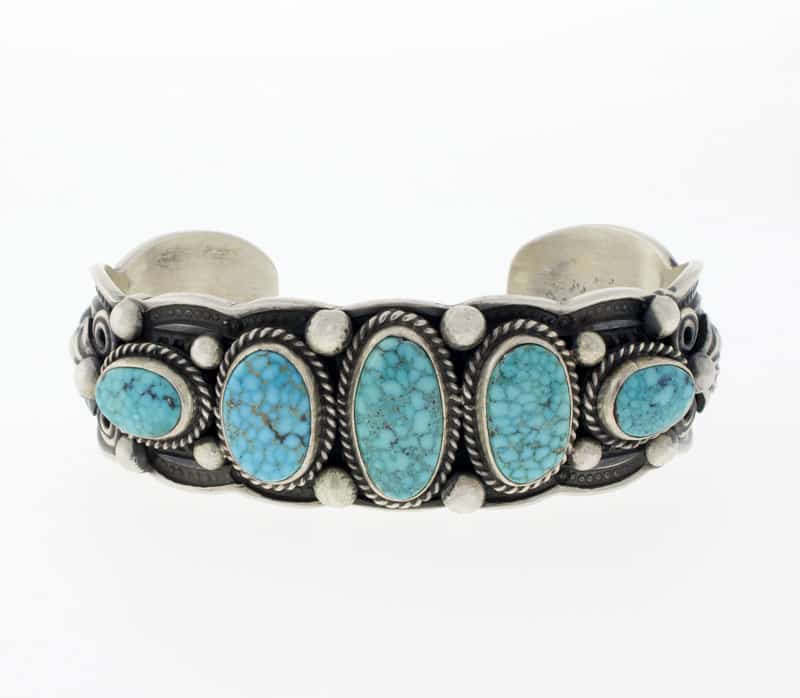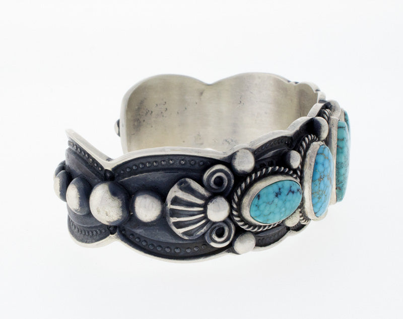 「オールド スタイル」のスターリング シルバー ブレスレット。5 列の天然バーズアイ キングマン ターコイズ ストーンがセットされています。ナバホ族のアーティスト、DARRELL CADMAN による見事なハンドメイドとデザインです。