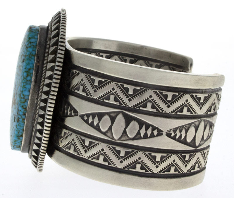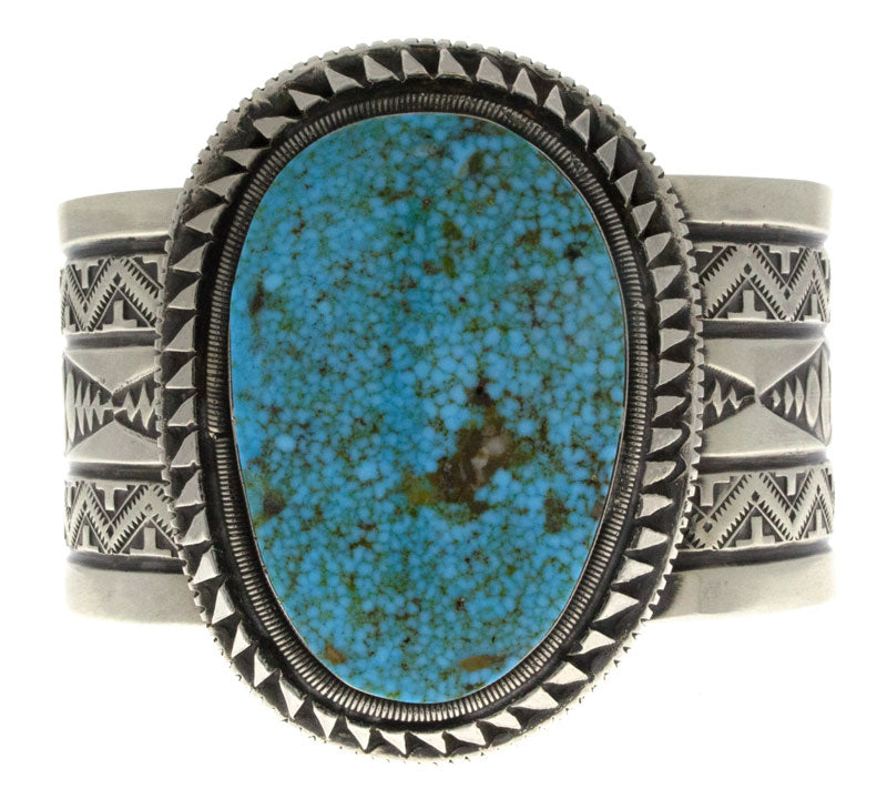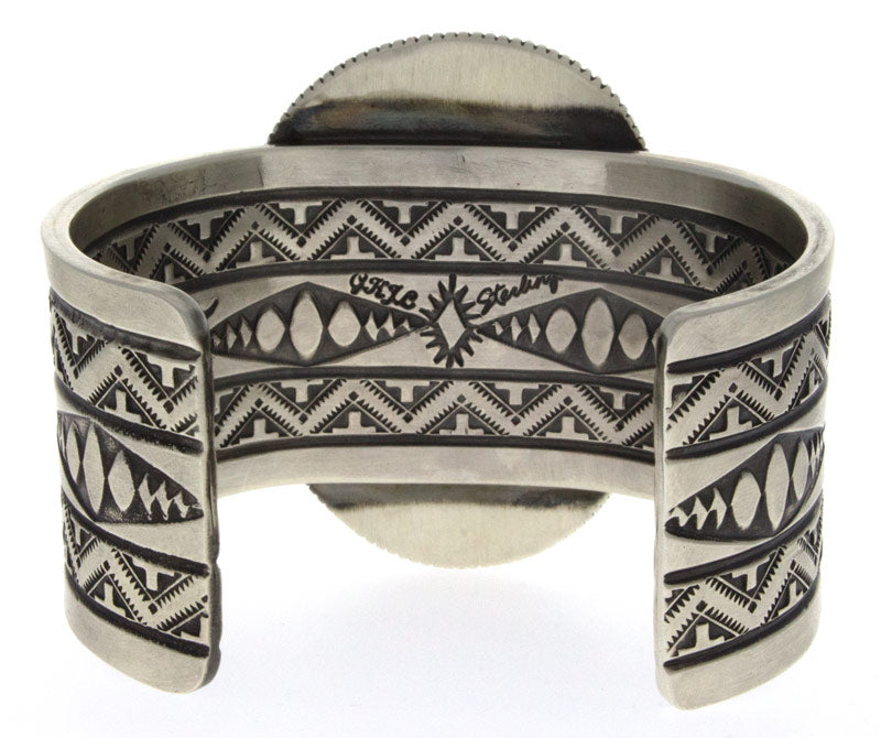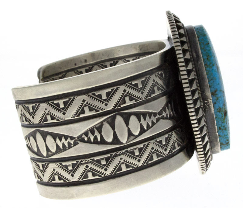 「オールド スタイル」のヘビーゲージ スターリング シルバー ブレスレット。大きなキングマン ターコイズ ストーンがセットされています。ナバホ族のアーティスト、グレン リビングストンによる見事なハンドメイドとデザインです。