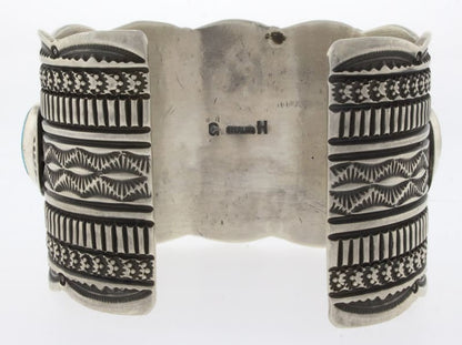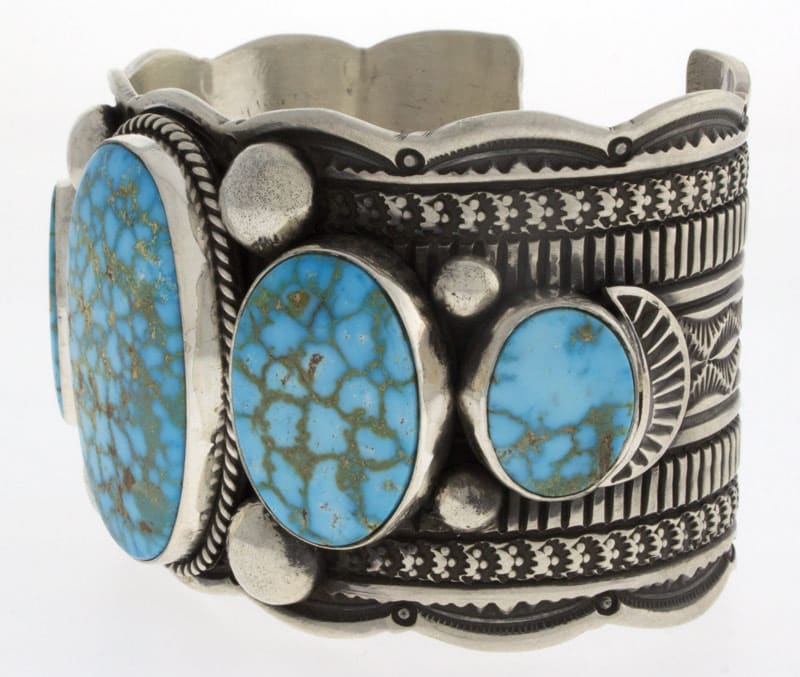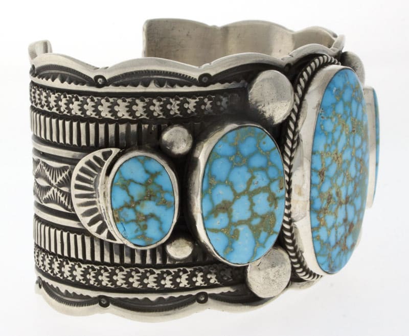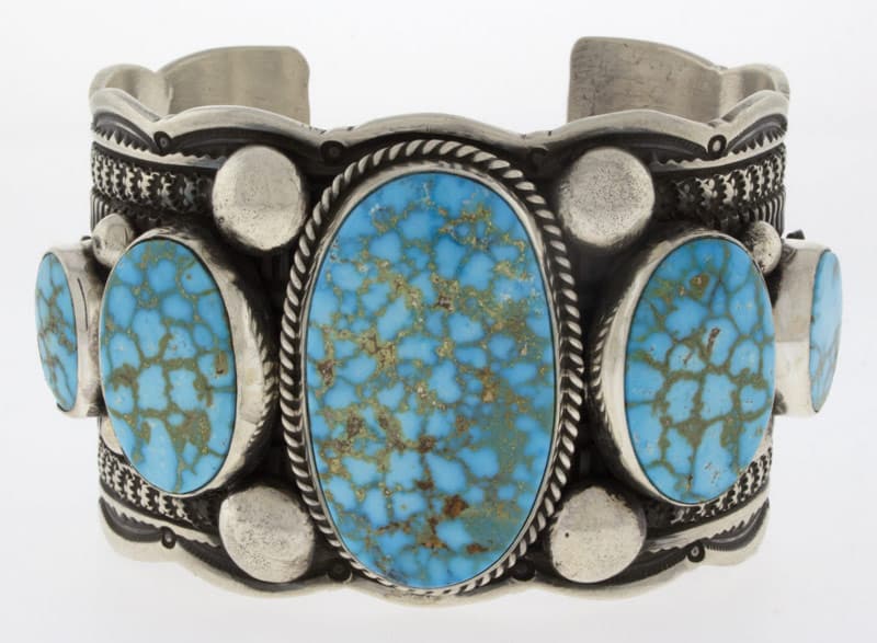 「オールド スタイル」のヘビーゲージ スターリング シルバー ブレスレット。5 列の天然バーズアイ キングマン ターコイズ ストーンがセットされています。ナバホ族のアーティスト、GUY HOSKIE による見事なハンドメイドとデザインです。