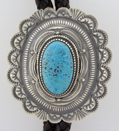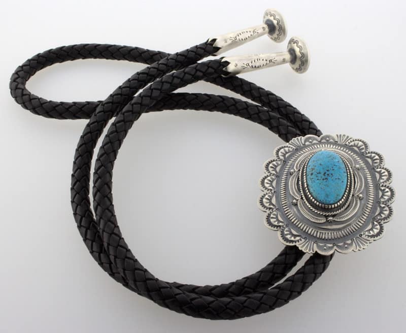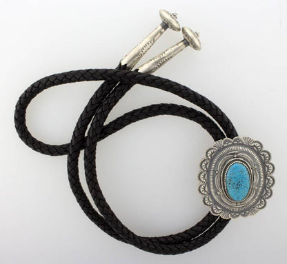 天然のキングマン ターコイズ ストーンをあしらったスターリング シルバーのボロ タイ セット。先端がスターリング シルバーの 46 インチ 10 プライ手編みレザー コードに取り付けられています。ナバホ族のアーティスト、HANK VANDEVER による見事なハンドメイド デザインです。