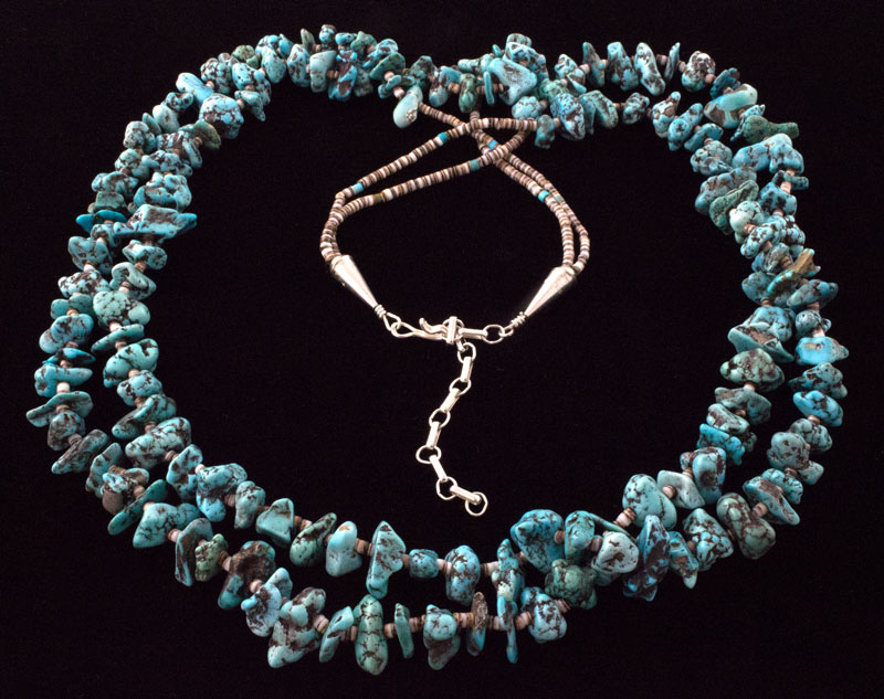 30~33インチの調節可能な長さの二連天然ローン マウンテン ターコイズ ナゲット ネックレス。天然ヘイシ貝付き。これらの印象的な天然ローン マウンテン ターコイズ ナゲットは、1970 年代にネバダ州トノパ近郊で採掘されました。ナバホ族のアーティスト、ヘレン ツォシーによる見事なハンドメイドとデザインです。