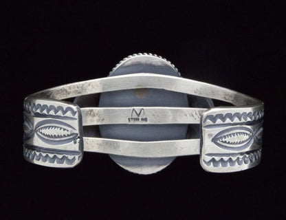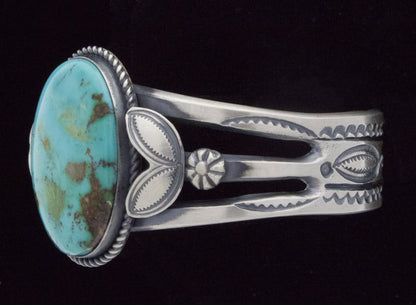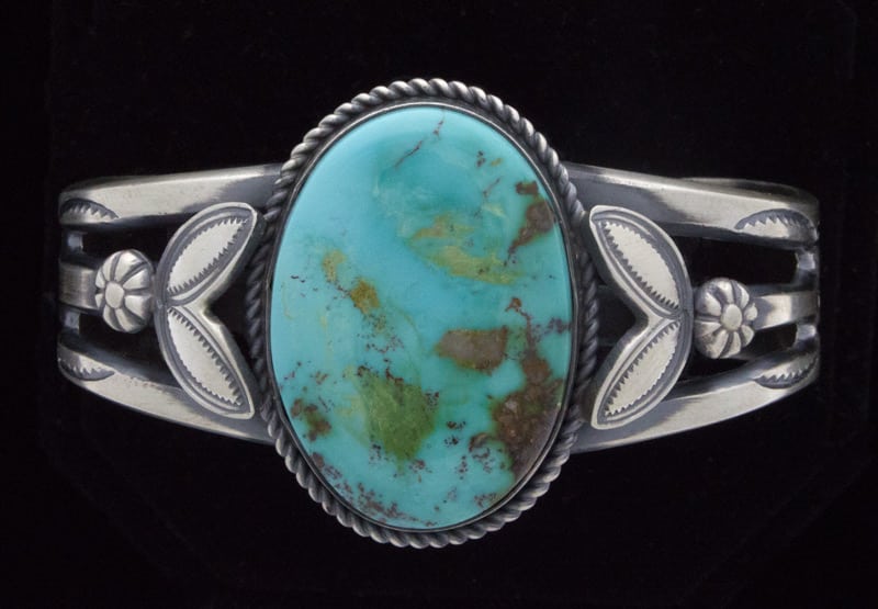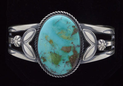 天然のロイストン ターコイズ ストーンをセットした「オールド スタイル」のスターリング シルバー ブレスレット。ナバホ族のアーティスト、ヘンリー モーガンによる見事なハンドメイドとデザインです。