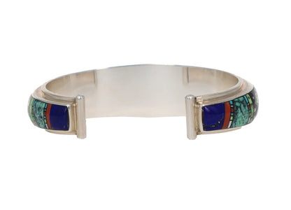 希少な天然ビスビー ターコイズ ストーンのチャネル インレイ デザインが施されたスターリング シルバー ブレスレット セット。ナバホ族のアーティスト、JULIUS BURBANK による見事なハンドメイドとデザインです。