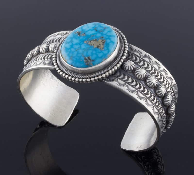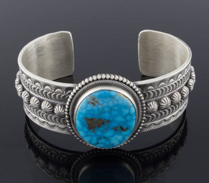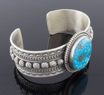 「オールド スタイル」のスターリング シルバー ブレスレット。バーズアイ キングマン ターコイズ ストーンがセットされています。ナバホ族のアーティスト、マイケルとローズ カラディットによる見事なハンドメイドとデザインです。