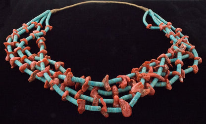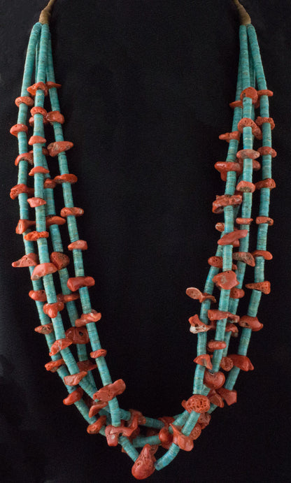 長さ 34 インチの 4 連キングマン ターコイズ ヘイシ ネックレス。天然地中海珊瑚チップ付き。このネックレスに使用されている天然地中海珊瑚チップはすべて、1960 年代までに採取されたとされるアーティストの父親の個人コレクションから調達されています。模造素材は使用されていません。サント ドミンゴ プエブロのアーティスト NESTORIA CORIZ による見事なハンドメイドとデザインです。