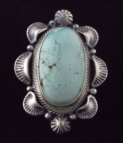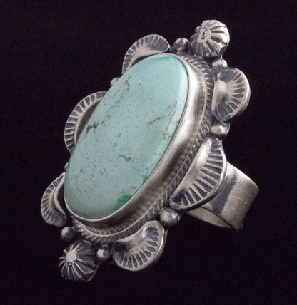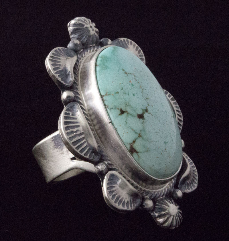 サイズ 7.75 スターリング シルバー リングに天然のゴールデン ヒル ターコイズ ストーンをセット。ナバホ族のアーティスト、RANDY BOYD による見事なハンドメイドとデザイン。