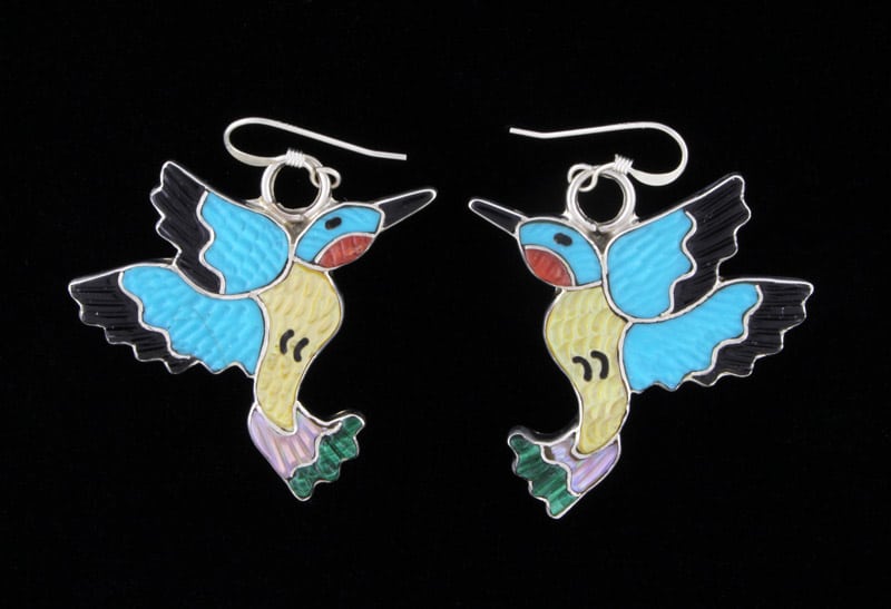 フランス製ワイヤー スターリング シルバーのハチドリ イヤリング。マルチカラーの手彫りの石の象嵌デザイン。ズニ族のアーティスト、TAMARA PINTO による見事なハンドメイドとデザイン。