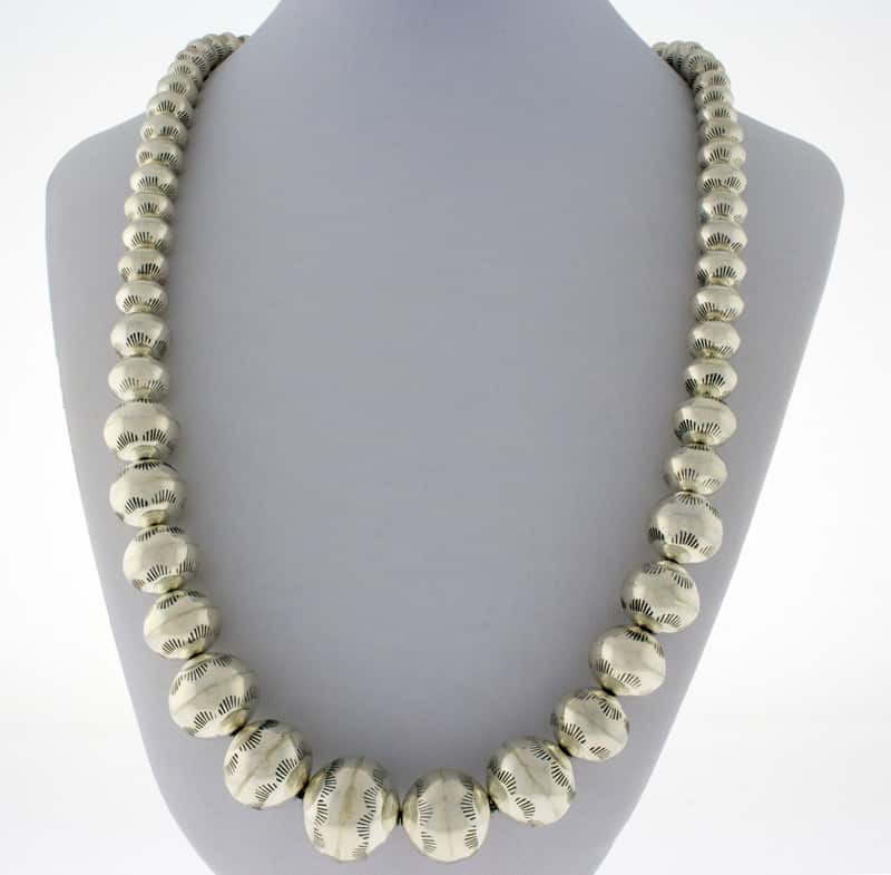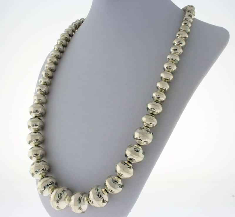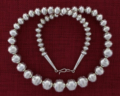 長さ 24.25 インチの段階的なスターリング シルバー ビーズ ネックレス。ナバホ族のアーティスト JEFFREY NELSON が巧みにハンドメイドし、デザインしました。