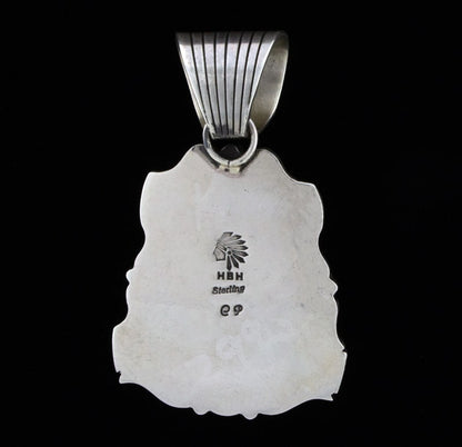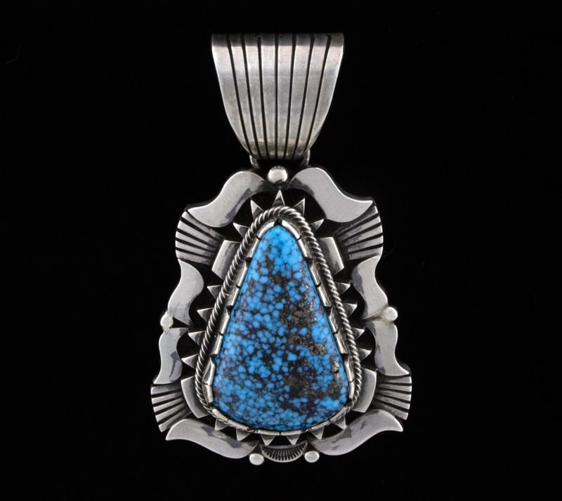 印象的なティアドロップ型の高級天然キングマン ターコイズ ストーンをあしらった、重量感のあるスターリング シルバーのペンダント セット。ナバホ族のアーティスト、CURTIS PETE による見事なハンドメイド作品です。