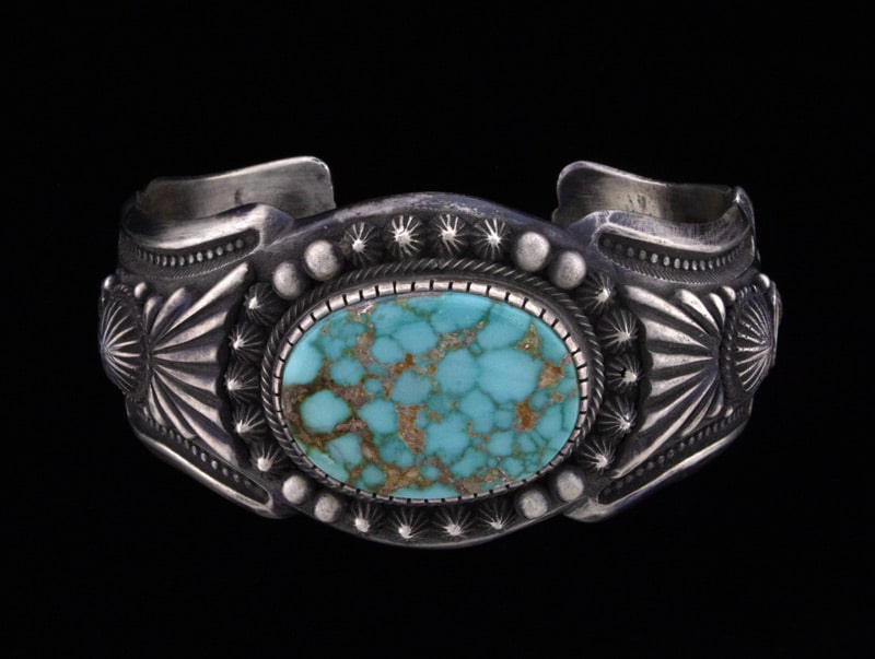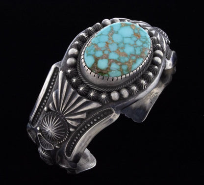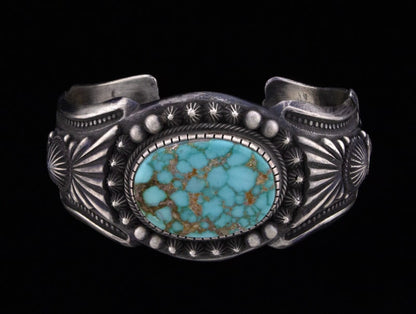 「オールド スタイル」のヘビーゲージ スターリング シルバー インゴット ブレスレット。印象的な高品質の天然パイロット マウンテン ターコイズ ストーンがセットされています。ナバホ族のアーティスト、HARRY H. BEGAY による見事なハンドメイドとデザインです。