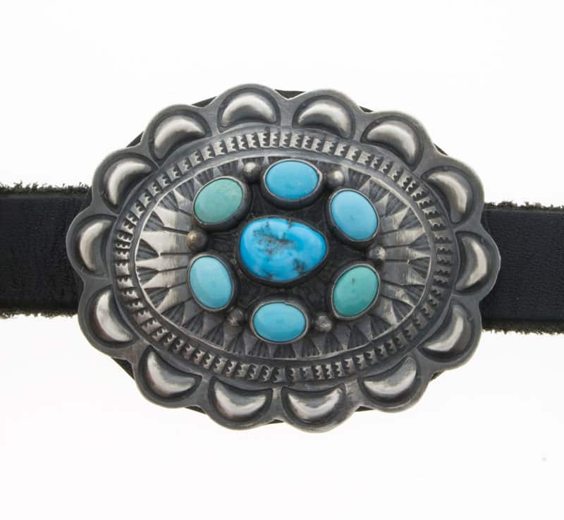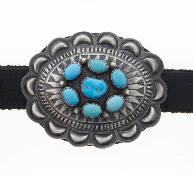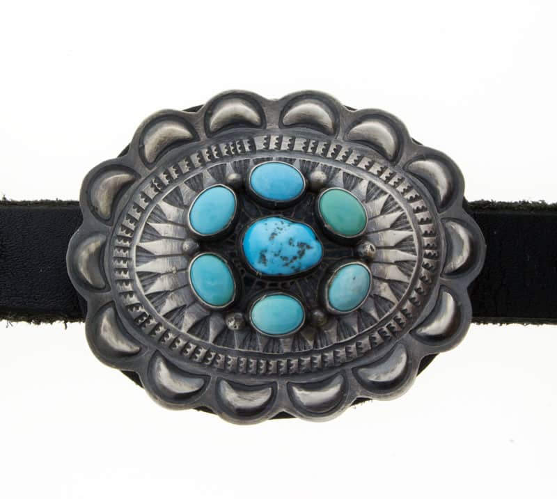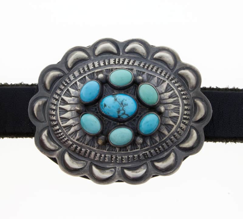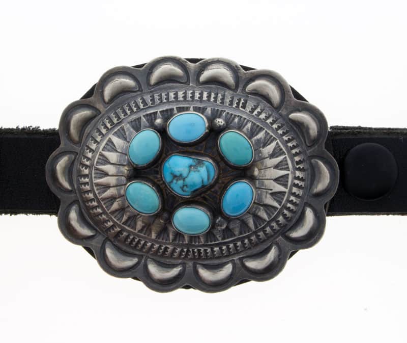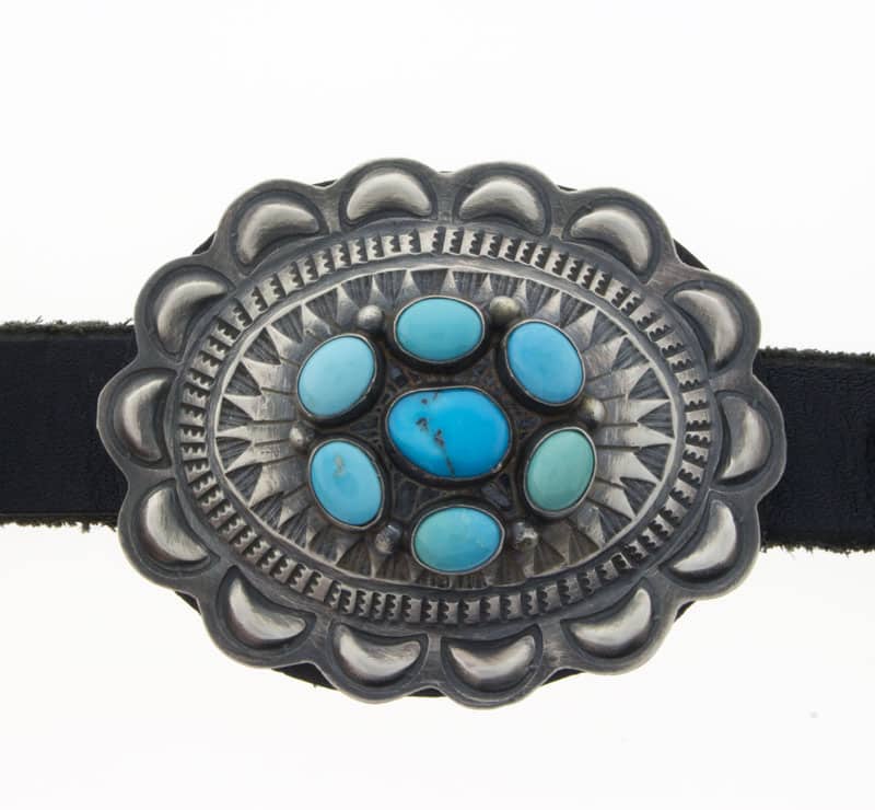 本革ベルト。スターリング シルバーのバックルと 9 個のスターリング シルバー コンチョが付属。各コンチョには 7 個のキングマン ターコイズ ストーンがセットされています。すべてのコンチョは革の裏地で支えられています。バックルとすべてのコンチョは、ナバホ族の著名なアーティスト、ダン マルティネスによって巧みに手作りされ、デザインされています。