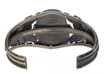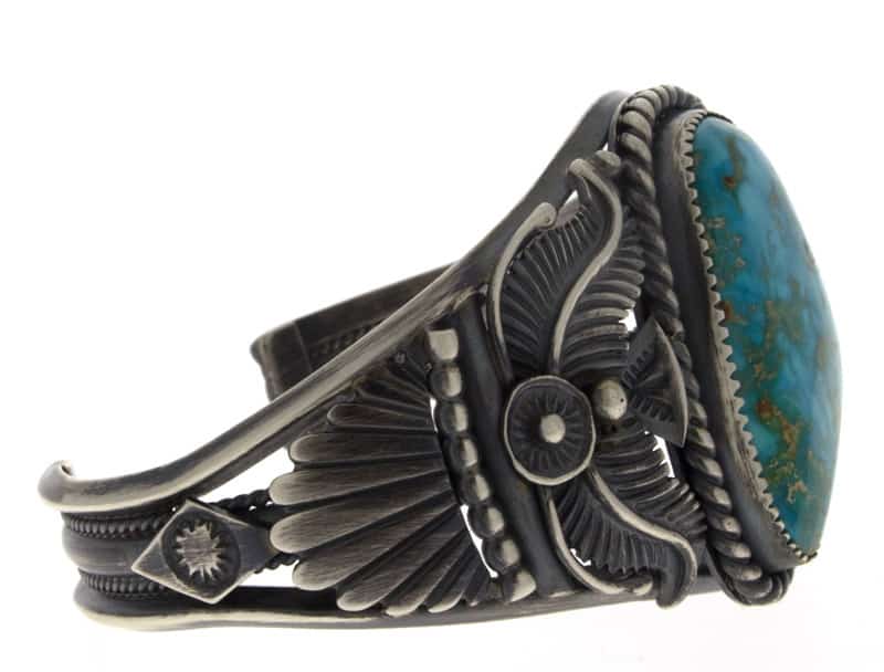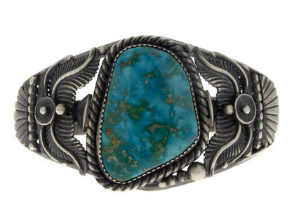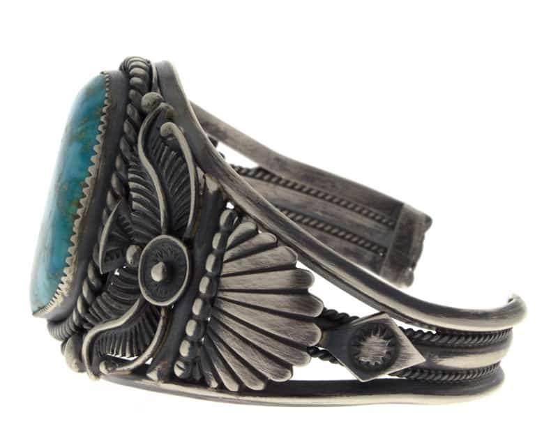 希少な天然ブルージェムターコイズストーンをあしらった「オールドスタイル」のスターリングシルバーブレスレット。ナバホ族のアーティスト、マイク・ベゲイによる見事なハンドメイドとデザインです。