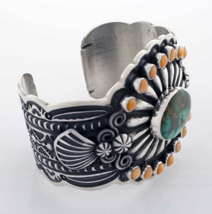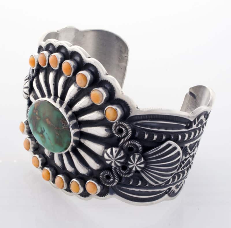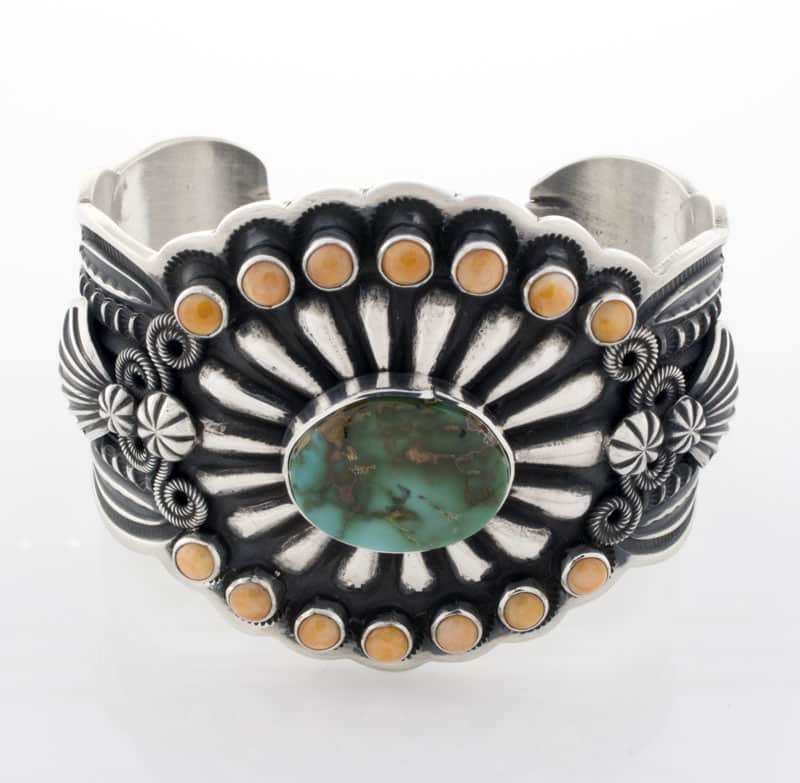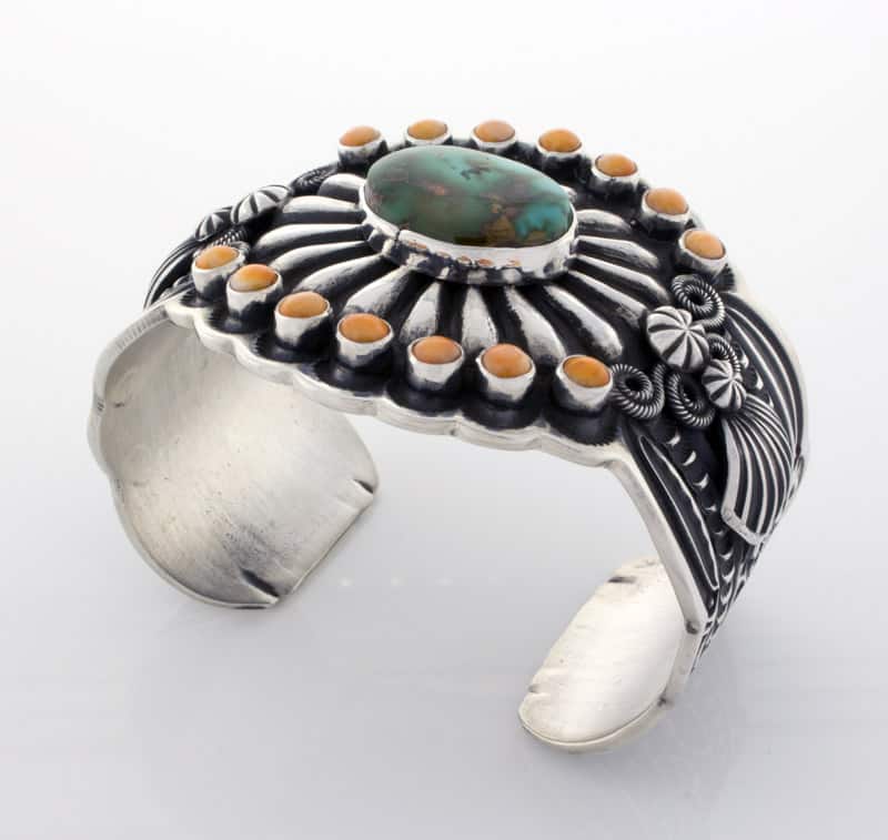 「オールド スタイル」のスターリング シルバー ブレスレット。天然のロイストン センター ストーンと 14 個のオレンジ色のスパイニー オイスター ストーンで囲まれています。ナバホ族のアーティスト、ダレル キャドマンによる見事なハンドメイドとデザインです。