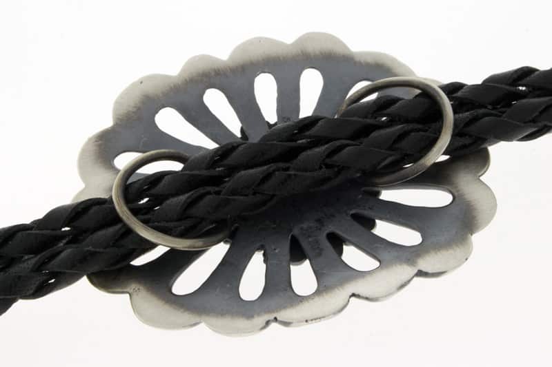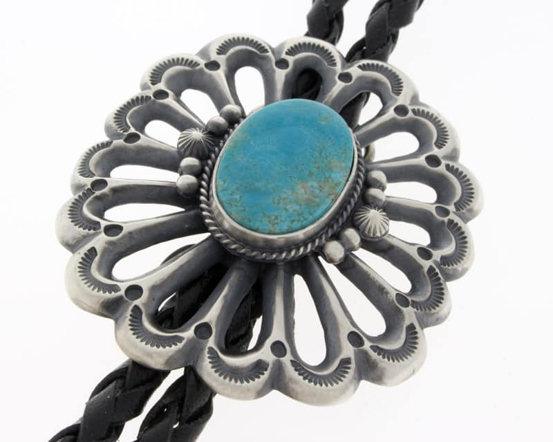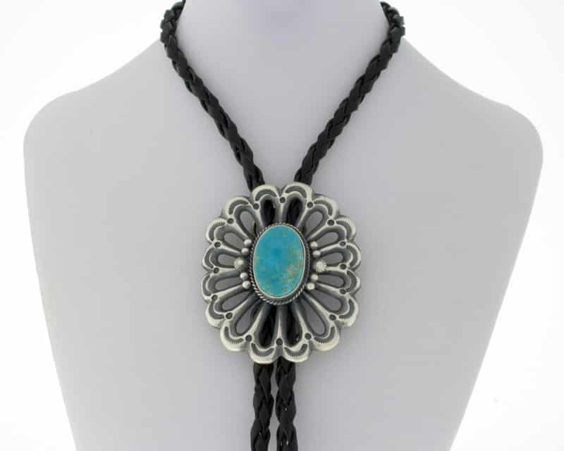 長さ 36 インチのサンドキャスト スターリング シルバーのボロタイ セット。天然のロイストン ターコイズ ストーン付き。ナバホ族のアーティスト、ハリソン ビツエによる見事なハンドメイドとデザイン。