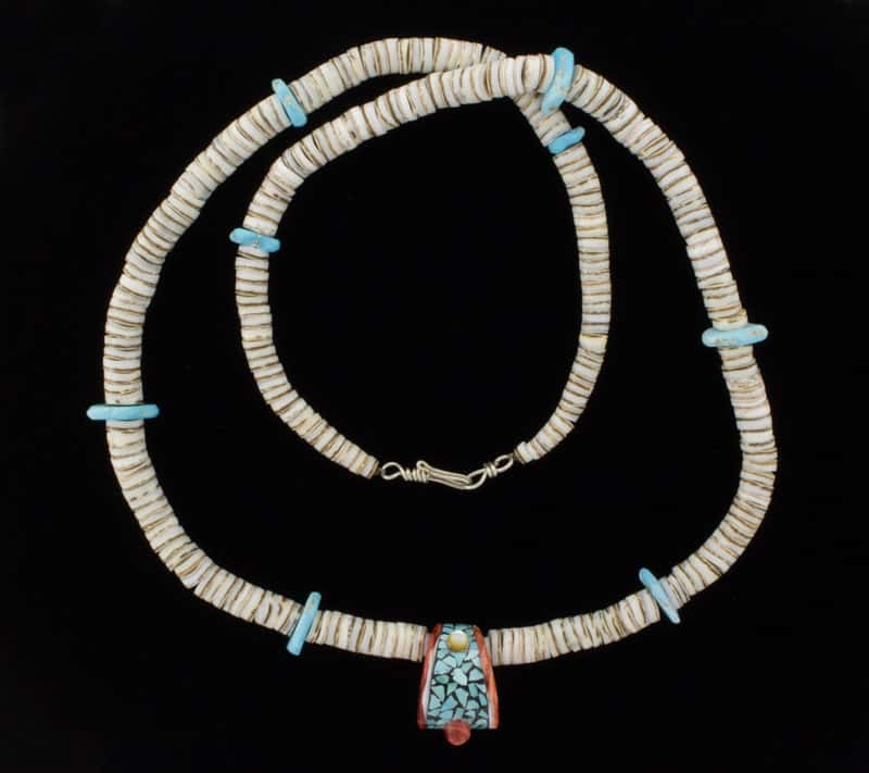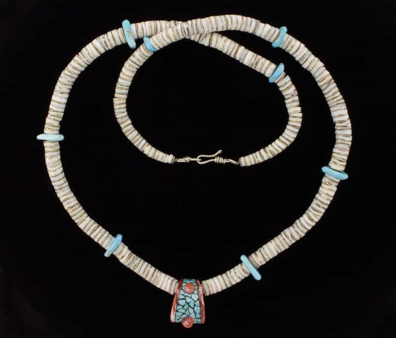 • ミュールジカの骨ペンダント: 側面にオレンジ色のスパイニーオイスターを重ねたキャッスルドーム型のターコイズ石のインレイと、オレンジ色のスパイニーオイスターとマザーオブパールの浮き彫りインレイが特徴です。