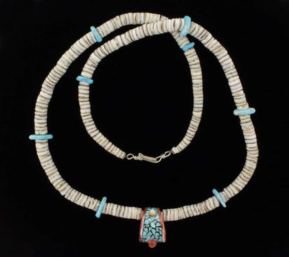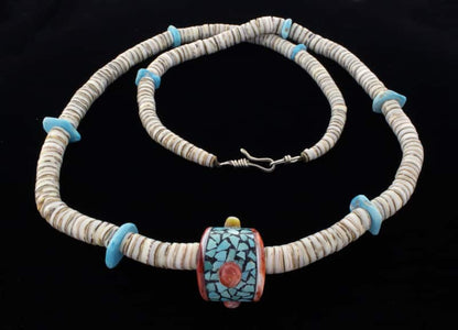 • ネックレス: 30 インチの手作業で弦を張り、手で巻いたオリーブ シェルのヘイシと、キャッスル ドーム ターコイズ ナゲット スペーサー。スターリング シルバーの「フック & アイ」コネクタは、これらのアーティストによって手作りされていない唯一のアイテムです。