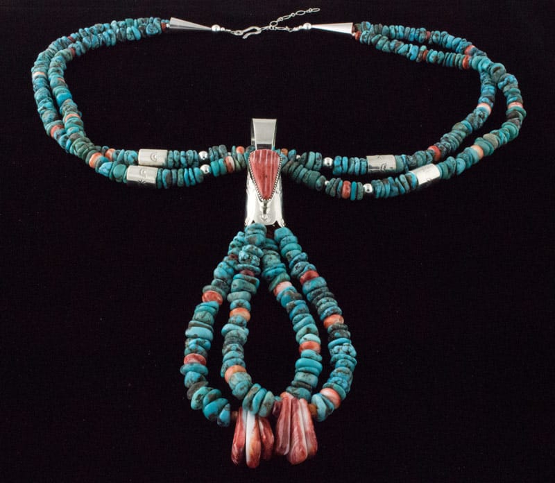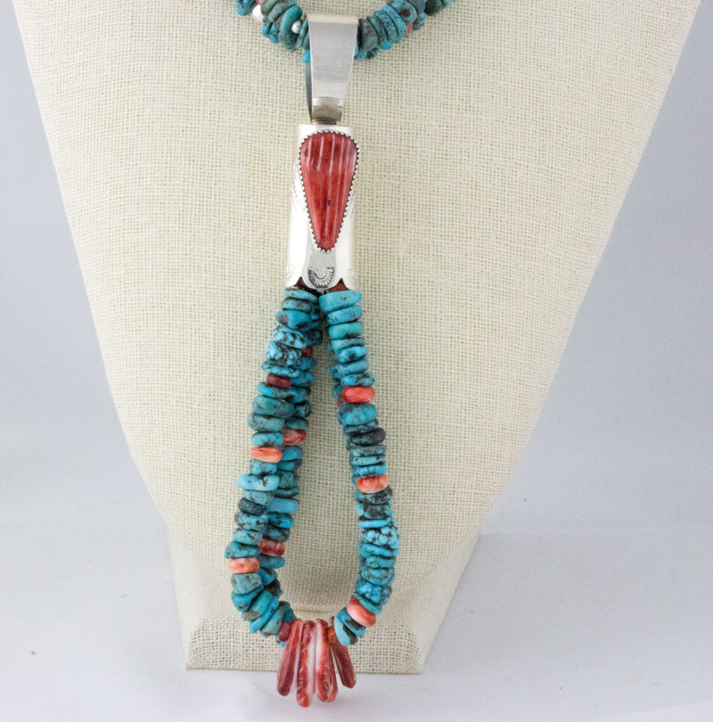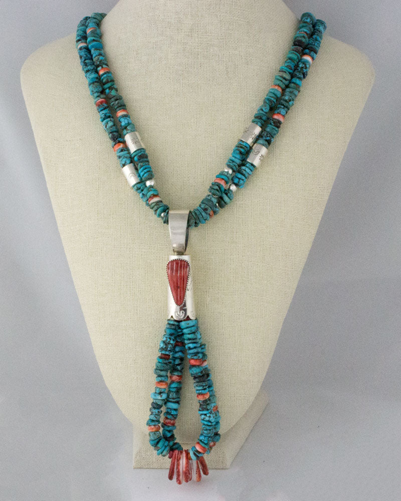 25"-28" Adjustable Length 2-Strand Kingman Turquoise Nugget Ceremonial Necklace Hung With A 2 Jacla Kingman Turquoise Nugget & Red Spiny Oyster Pendant.  Masterfully Handmade And Designed By Santo Domingo Pueblo Artist DANIEL CORIZ.  NO IMITATION MATERIALS USED.