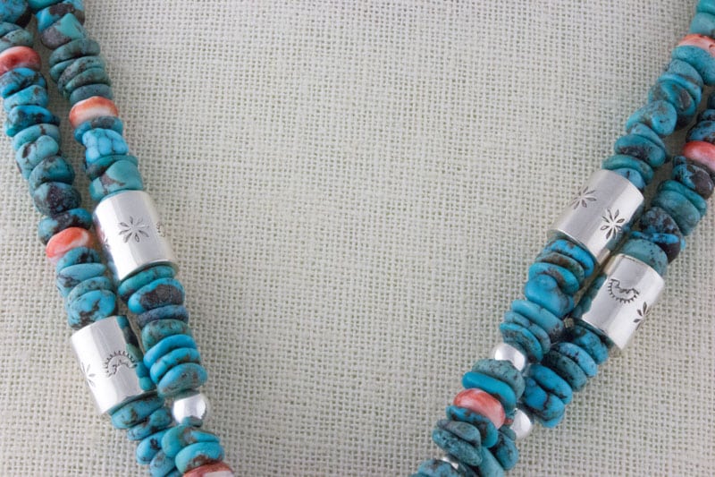 • Materials/Technique For Necklace:  Hand Cut, Polished And Strung Kingman Turquoise Nuggets And Orange & Red Spiny Oyster Beads; 4 Handmade And Hand Stamped Sterling Silver Barrel Beads And 8 Handmade Sterling Silver Beads; Handmade Sterling Silver Cones & Chain With Handmade Sterling Silver "Hook & Eye" Connector.