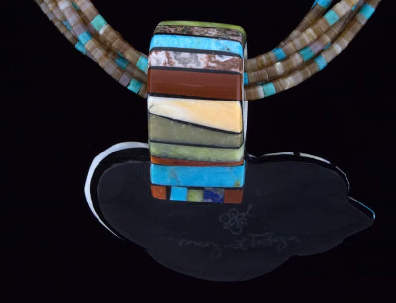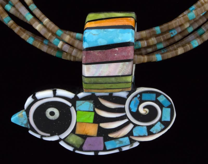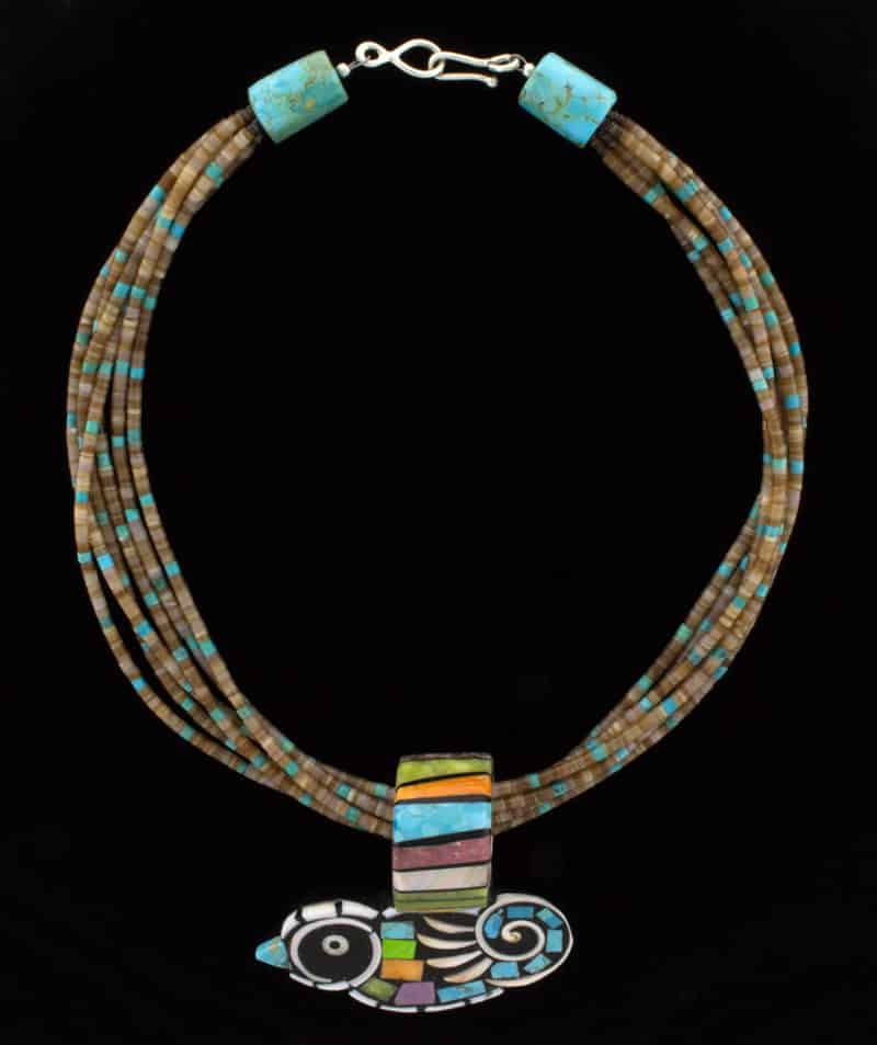 • Materials/Technique:   Hand Cut, Ground, Polished And Strung Gold Lip Shell And Kingman Turquoise Heishi; Handmade Kingman Turquoise Barrel Beads At Each End Connected To Handmade Sterling Silver Hook & Eye Connector;  Stone On Stone Inlaid Bail On Cow Bone Backing; Stone On Stone Inlaid Bird Pendant On Jet Backing; Inlaid Stones And Shell Used Include Pink Mussel Shell, Kingman Turquoise, Norwegian Thulite, Green Serpentine, Royal Purple Agate, White Clam Shell, Gaspeite, Pipestone, Leopard Jasper, Denim Lapis, Orange Spiny Oyster, Jet, Maligano, Conus Shell Hanging